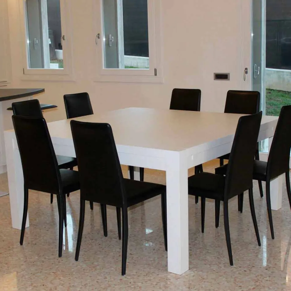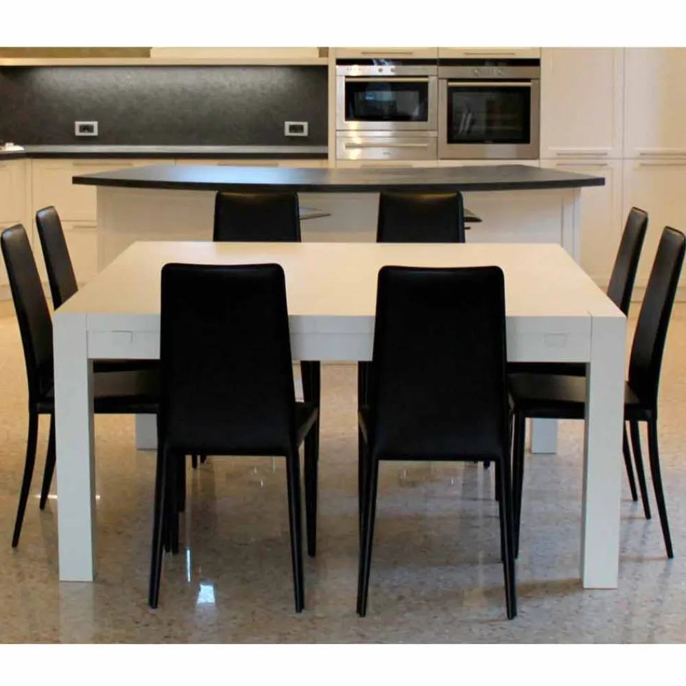 Der Jacob- Ausziehtisch zeichnet sich durch den oberen Schnitt an den Ecken aus, der als Sitz für die Beine dient, um eine Kontinuität und Linearität zu erzielen. Es ist aus massiver Eiche, matt lackiert, erweiterbar durch Verlängerungen in das Gehäuse versteckt unter der Spitze.