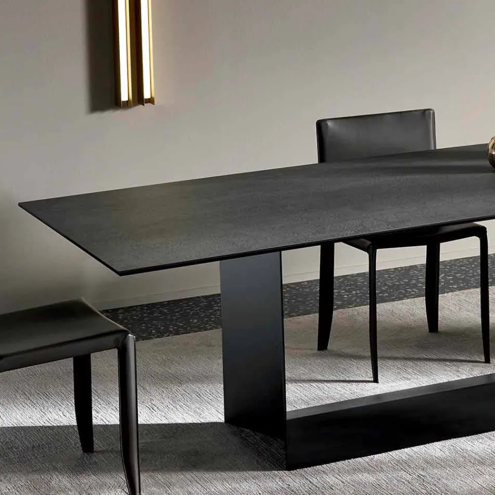 Luxustisch aus matt anthrazitfarbener Savoyer Steinkeramik und schwarzer Graphitmetallbasis, hergestellt in Italien.