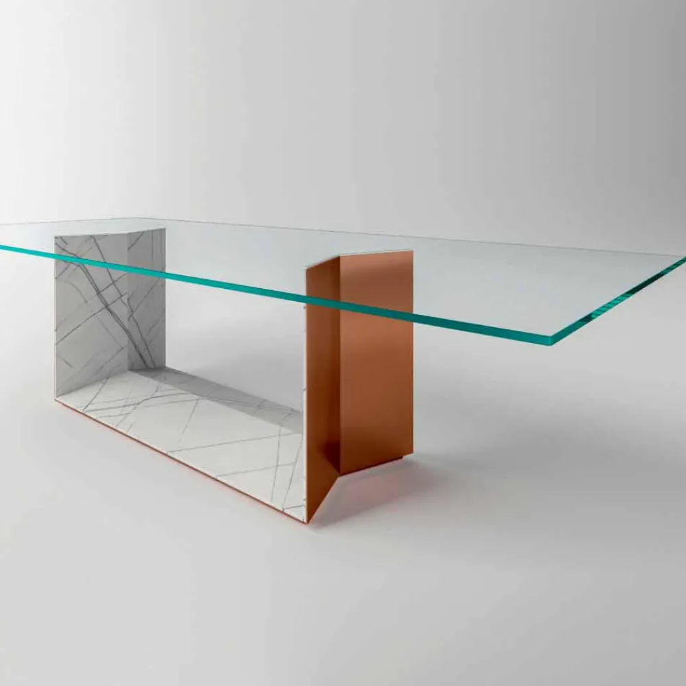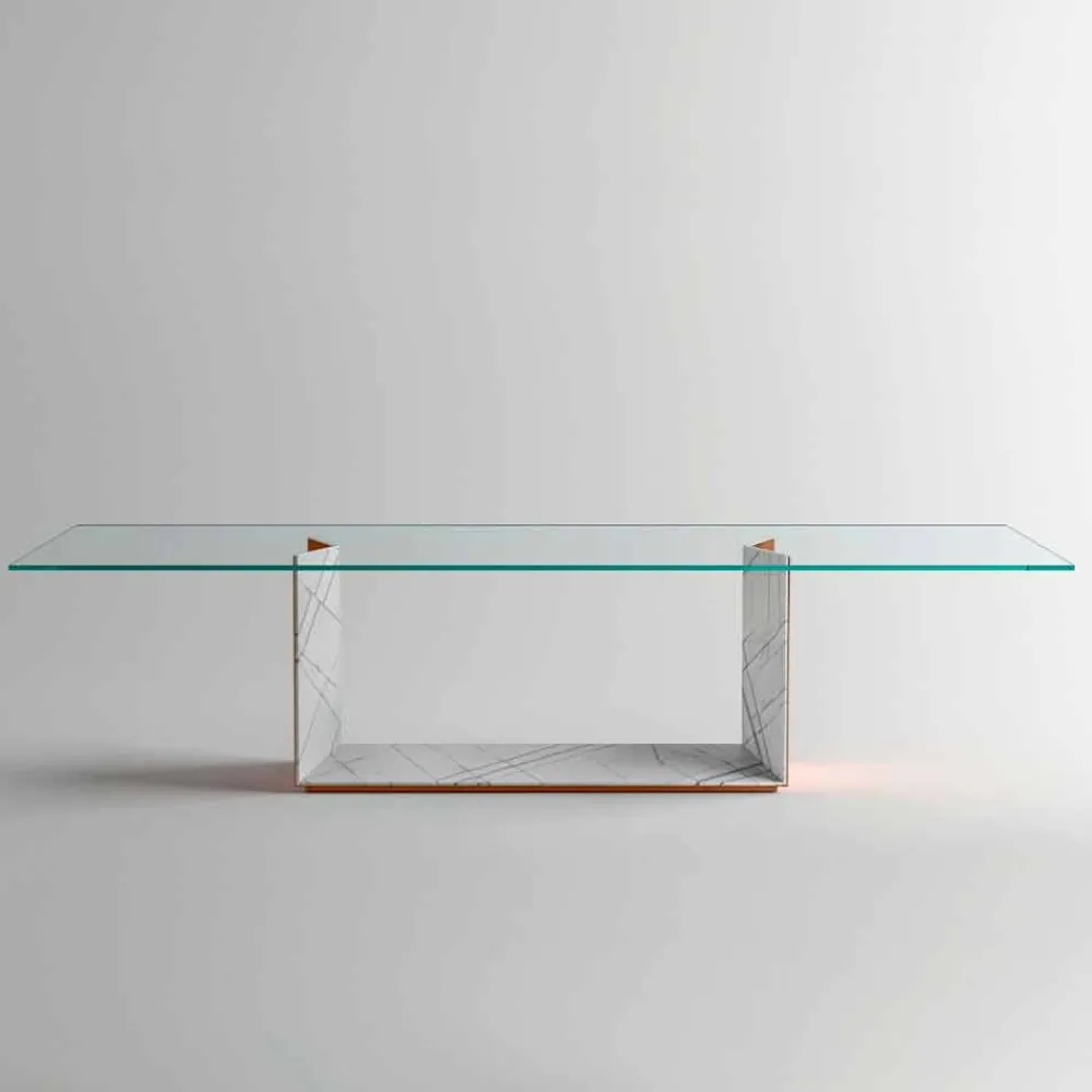 Esstisch mit extra klarer Glasplatte und Metallbasis aus Made in Italy-Marmor.