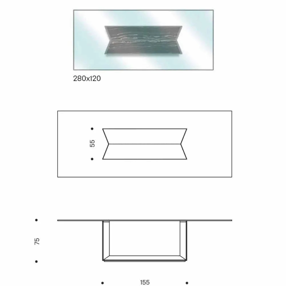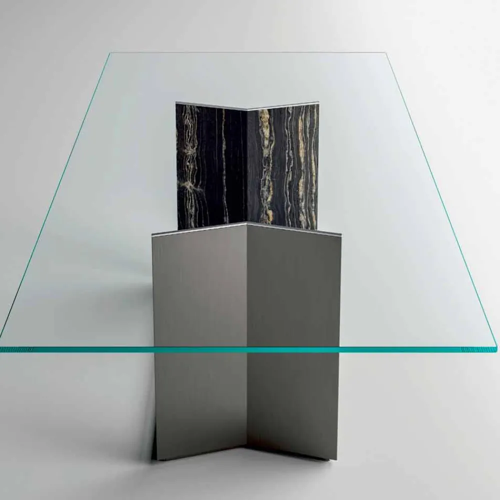 Design- Esstisch made in Italy mit extra klarer Platte aus gehärtetem Glas, die auf eine Edelstahlplatte geklebt ist. Die zentrale Basis des Tisches besteht dagegen aus Metall mit einer außen matt gebürsteten Beschichtung und einer innen matt gebürsteten Marmorbeschichtung . Die Kombination von Oberflächen und Materialien verleiht dem Tisch ein äußerst elegantes und raffiniertes Design, das ideal ist, um in Speisesälen mit einem zeitgemäßen und raffinierten Stil die Aufmerksamkeit auf sich zu ziehen.