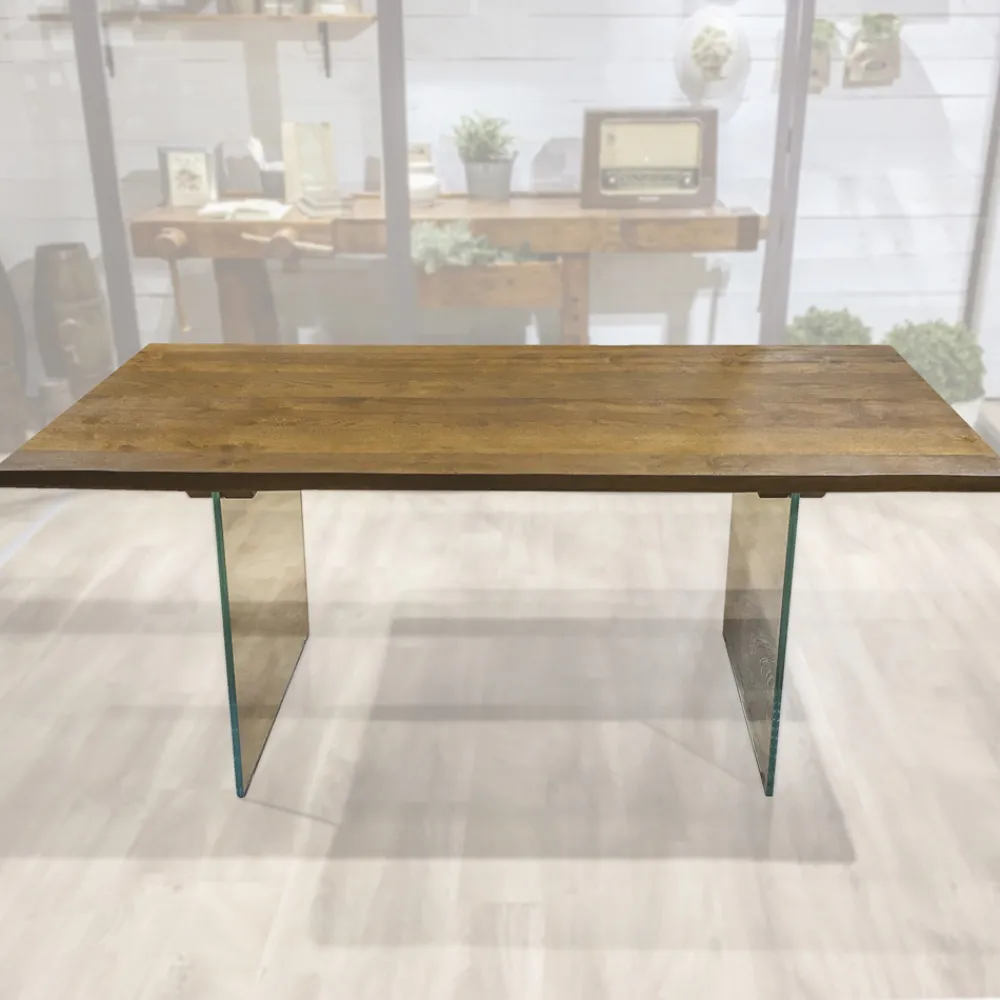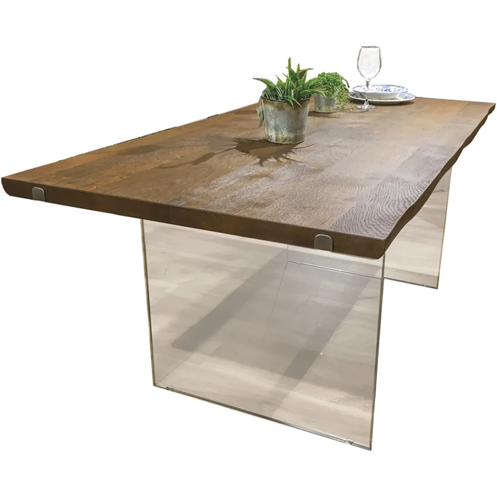 Holztisch aus geknoteter Eiche und Kristallsockel Made in Italy.