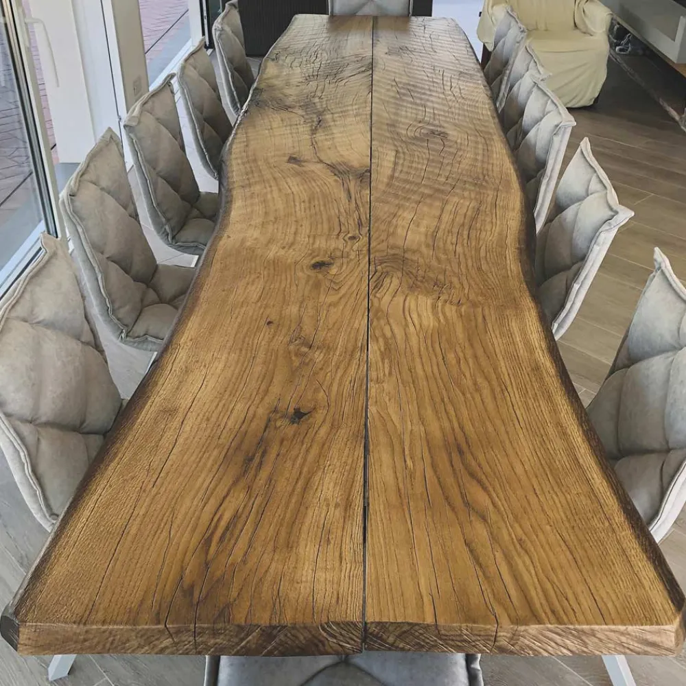 Die Oberseite wird direkt aus dem Stamm gewonnen. Zwei Hälften werden aus den jahrhundertealten Eichenstämmen gewonnen und zu einzigartigen Stücken mit variabler Breite von 90 bis 100 cm zusammengefügt. Die Rinde des Baumes bleibt in ihrer Natürlichkeit erhalten und erzeugt eine außergewöhnliche Wirkung.