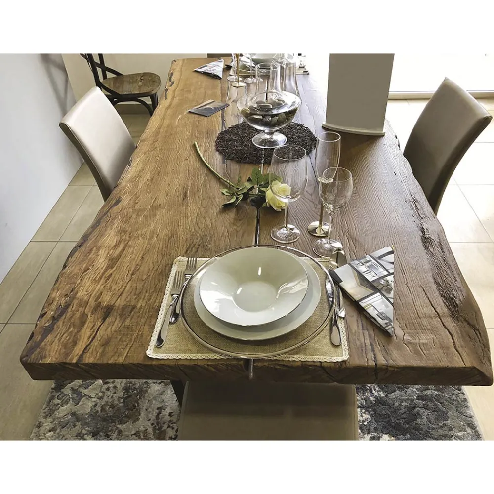 Dieser Tisch mit einer Platte aus kostbarem Eichenholz und einem Metallgestell scheint Sie auf eine Reise in die Seele des Baumes mitzunehmen, die auf die Schönheit und Kraft der Natur trifft. Das elegante und raffinierte Design , kombiniert mit der Majestät des Holzes , macht es zu einem perfekten Stück für jede häusliche Umgebung und dank seiner großen Abmessungen ist es optimal, um Ihr Mittag- oder Abendessen mit Freunden zu begleiten.