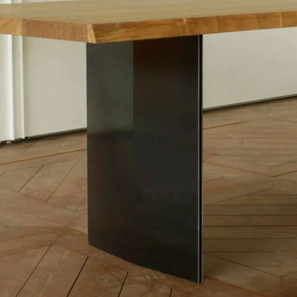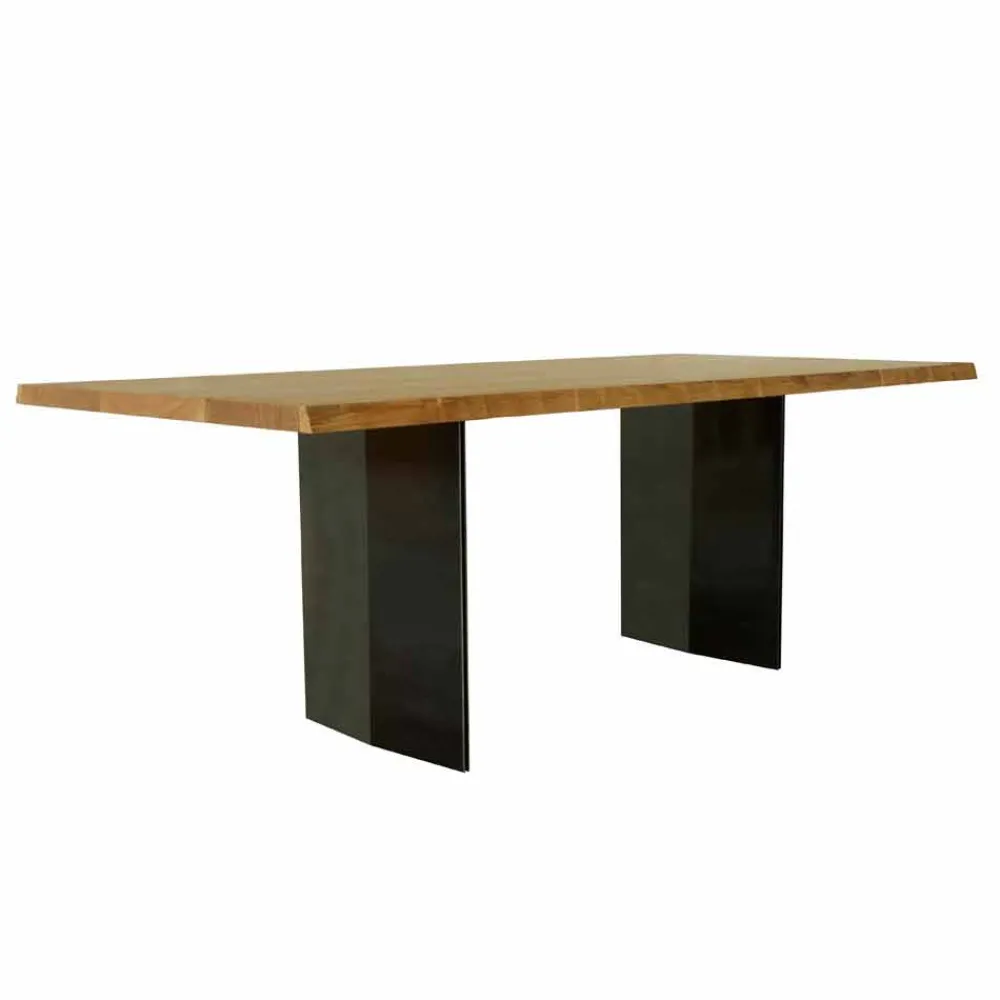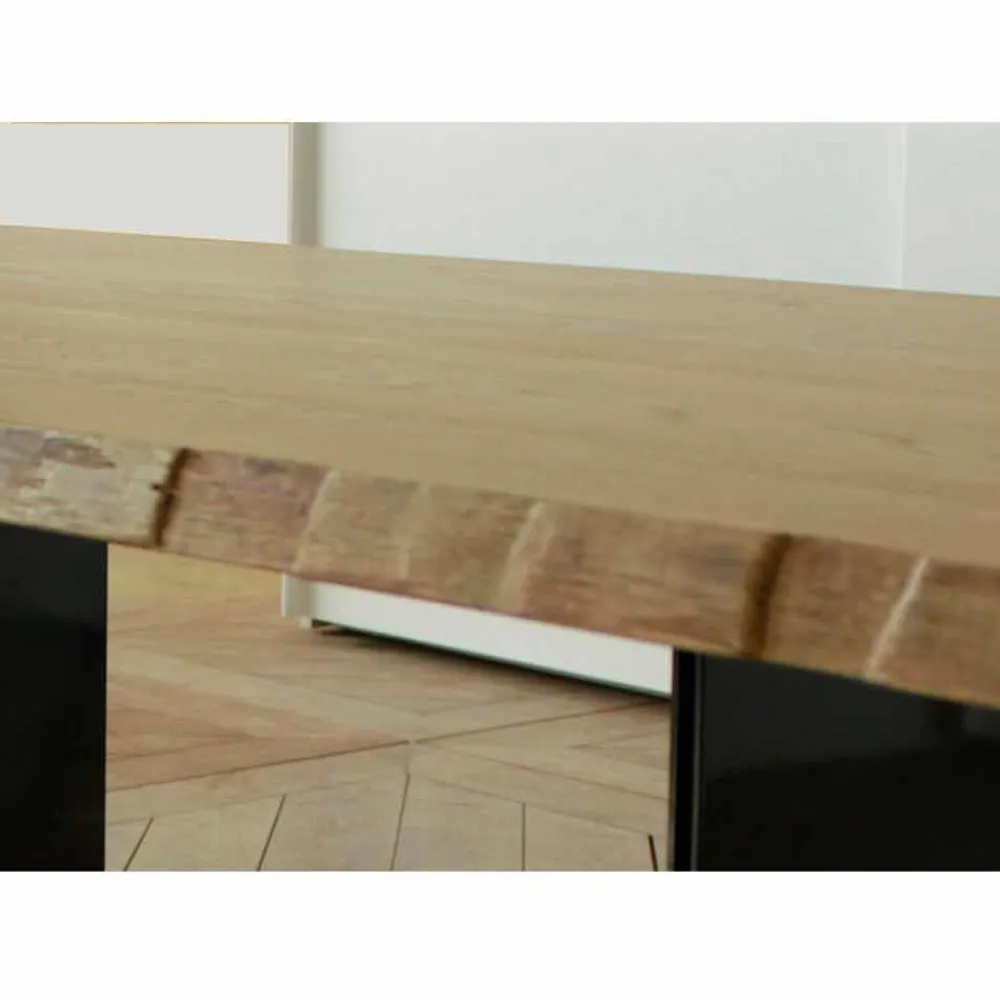 Der feste Tisch von Paul zeichnet sich durch ein helles Holzdach aus Eichenholz aus, das in Formen und Farben unregelmäßig ist, genau wie die Natur es schafft. Keller in rohem schwarzem Blatt, das mit Öl beendet wurde.