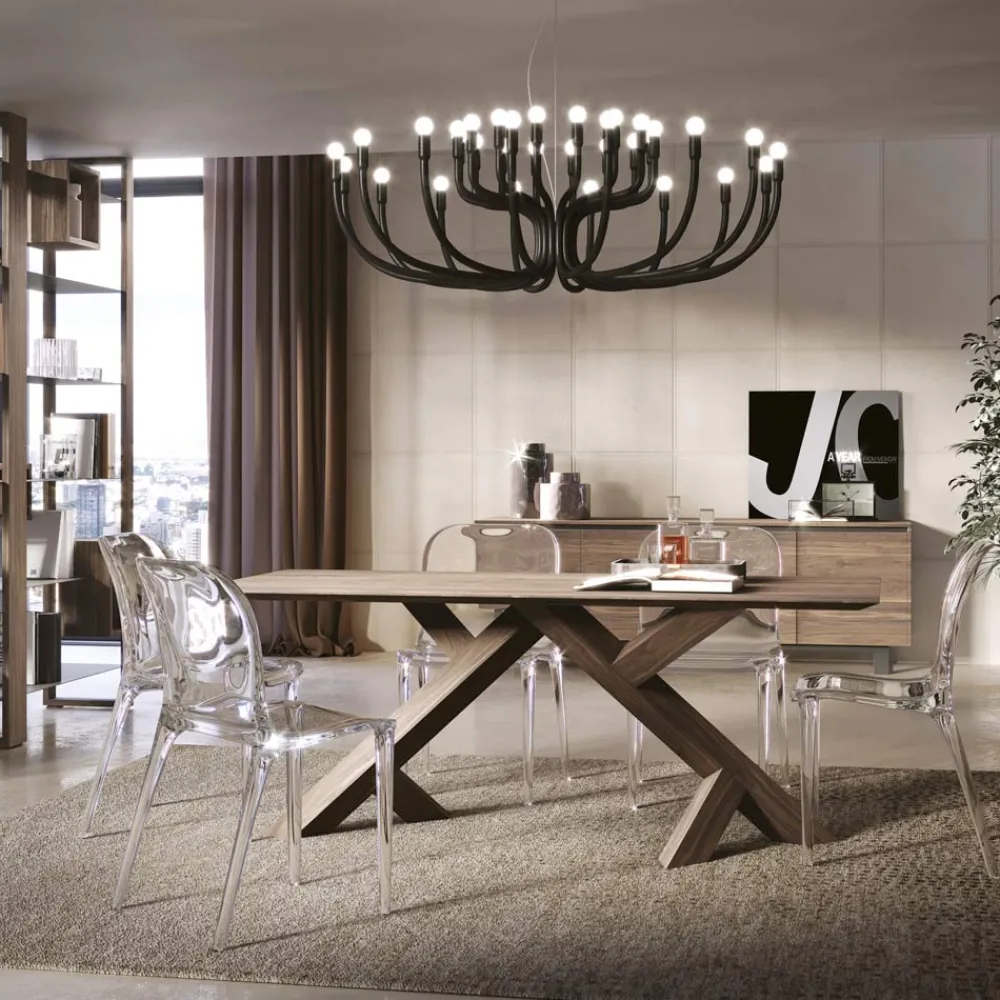 Indoor-Tisch mit Platte aus massivem Nussbaum geknotet mit natürlichen Farbtönen, die in verschiedenen Kanten erhältlich sind. Die Basis besteht aus zwei Massivholzbeinen . Das Produkt wird vollständig in der Toskana hergestellt , unter Verwendung hochwertiger Materialien und vor allem unter Berücksichtigung der Umweltauswirkungen , der Arbeit mit natürlichen Materialien und der Verwendung ungiftiger Produkte . Die Möglichkeit der Verlängerung ist durch Edelstahlführungen gegeben, die ein leichtes Öffnen ermöglichen.
