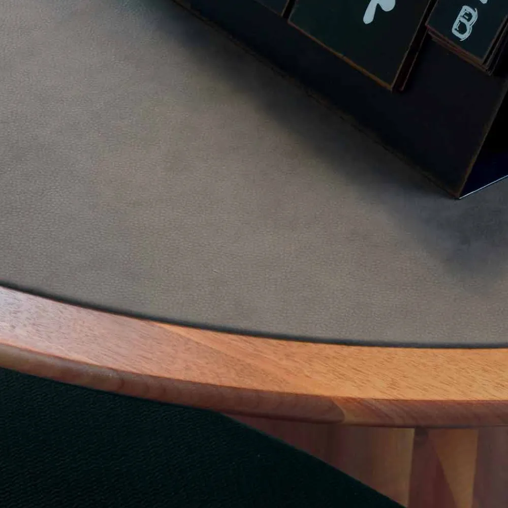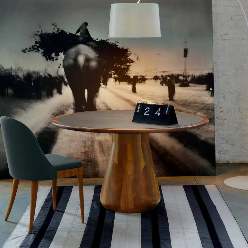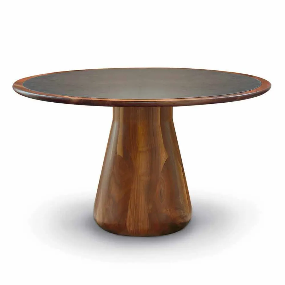 Fester runder Tisch mit massiver Walnussplatte. Sockel aus massiv gedrechseltem Canaletto-Walnussholz. Carlo verfügt über klare Gesichtszüge und Linien, die seinen Wert steigern. Aus natürlichem Walnussholz gefertigt und mit Öl behandelt, zeigt er seine besondere stilistische Raffinesse durch die Form des Sockels und der mit Öko-Leder bezogenen Oberseite.