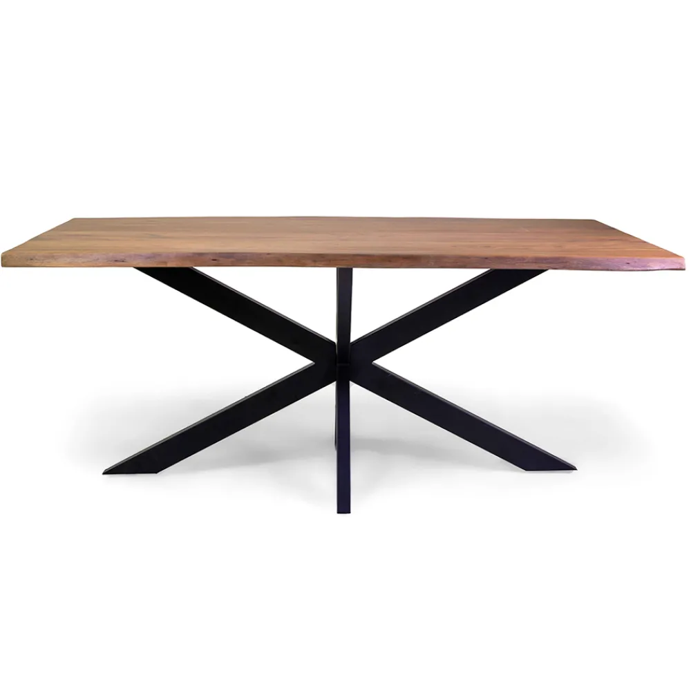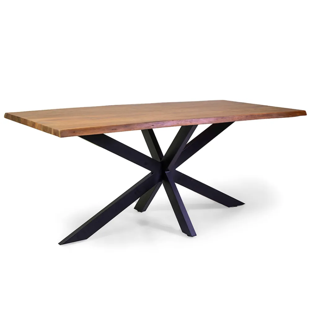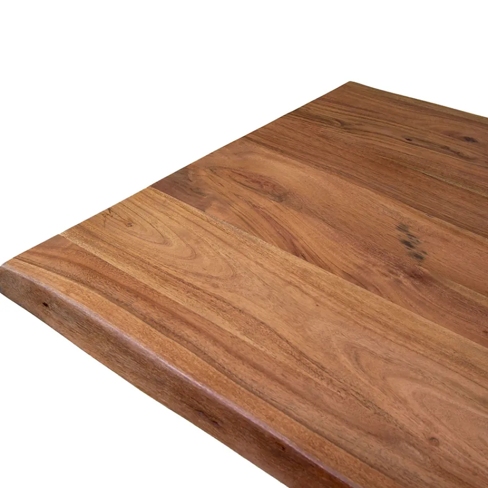 Esstisch mit einer 3,5 cm dicken Platte aus massivem Akazienholz und einem schwarzen Metallgestell.