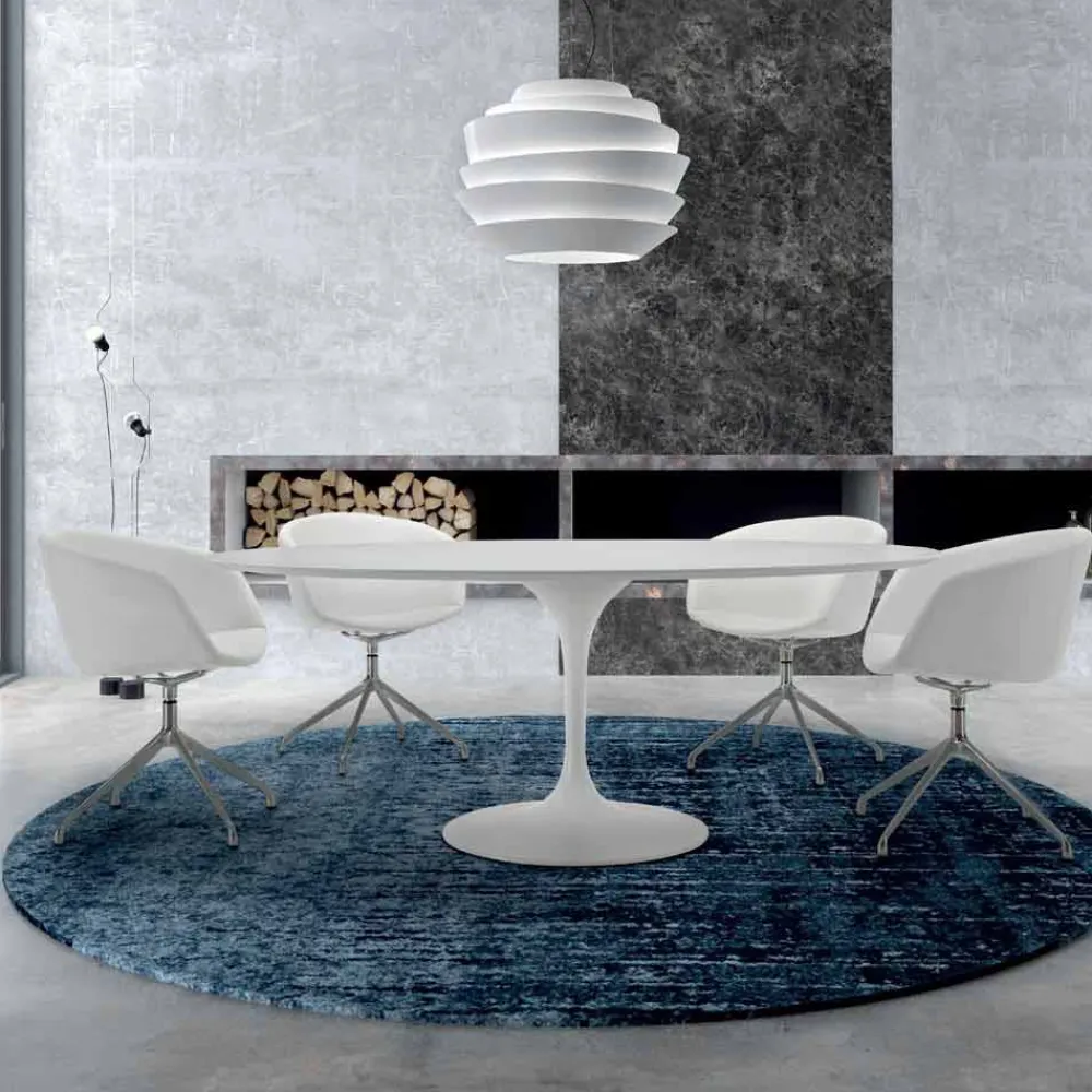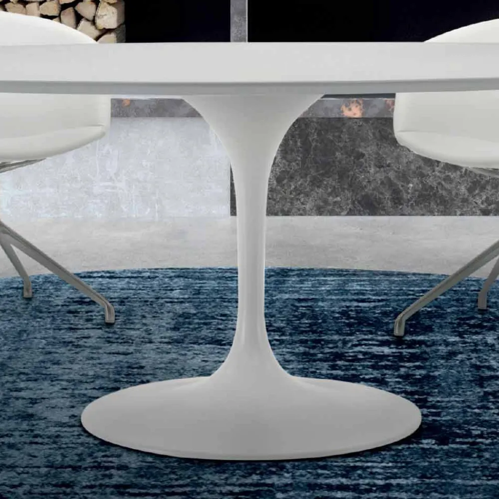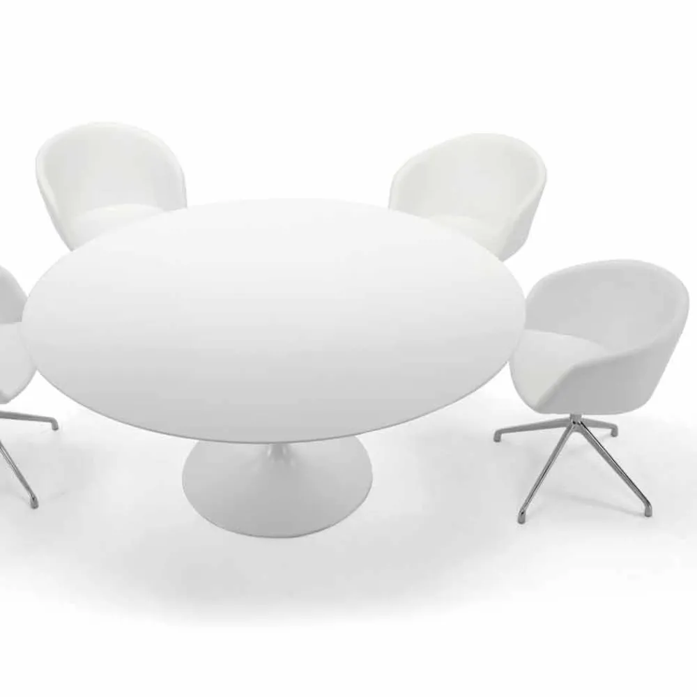 Moderner runder Esstisch mit flüssiger Laminatplatte und Aluminiumbasis, hergestellt in Italien.