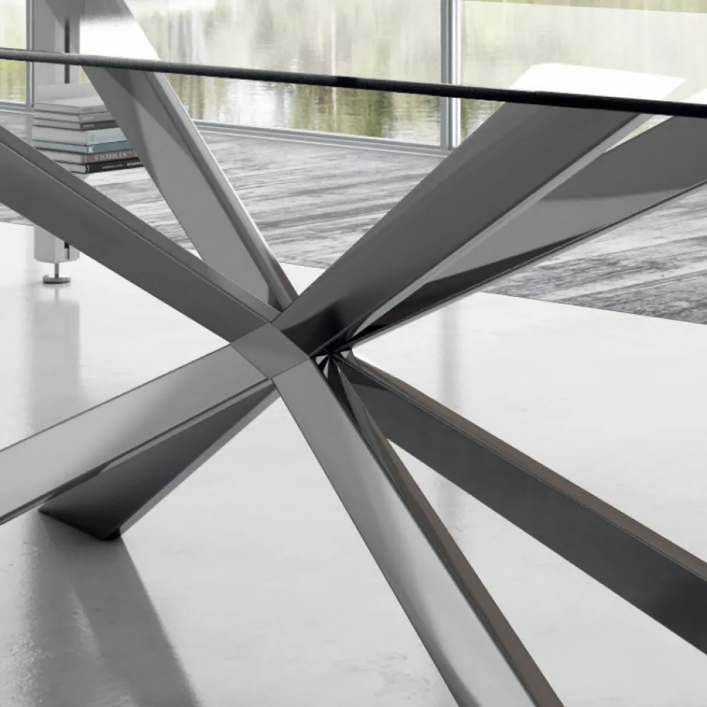 In Italien hergestellter Esstisch mit tonnenförmiger Platte aus transparentem, extraklarem Hartglas (12 mm dick) und lackiertem Stahlgestell . Ein raffiniertes Einrichtungsaccessoire, das dank seines faszinierenden Designs und seiner originellen Form die Aufmerksamkeit auf sich zieht und jeder modernen Einrichtung eine exklusive Note verleiht. Die herrliche Kombination aus der zeitlosen Eleganz von Glas und der originellen Form der Fassplatte erweckt einen Esstisch mit einer raffinierten Seele zum Leben, der den umgebenden Stil mit einer einzigartigen und modernen Note vervollständigt. So entsteht eine Einrichtungslösung mit klassischer Ästhetik, ideal für diejenigen, die einen anspruchsvollen Geschmack lieben, aber nicht auf grundlegende Aspekte wie Qualität und Langlebigkeit verzichten möchten.