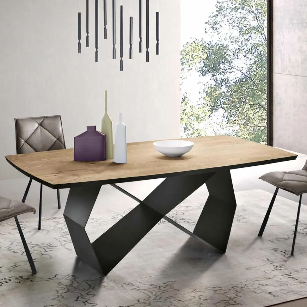 Die Metallbeine mit ihrer markanten, geometrischen Form sind lackiert und bilden einen schönen Kontrast zum Holzton. Diese Materialkombination sorgt nicht nur für solide Stabilität, sondern ist auch ein eindrucksvolles optisches Element, das diesen Tisch zu einem echten Blickfang in jedem Esszimmer oder offenen Bereich macht.