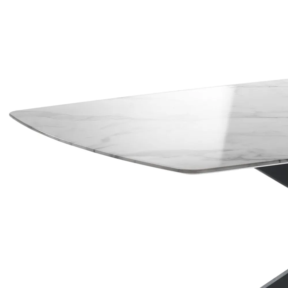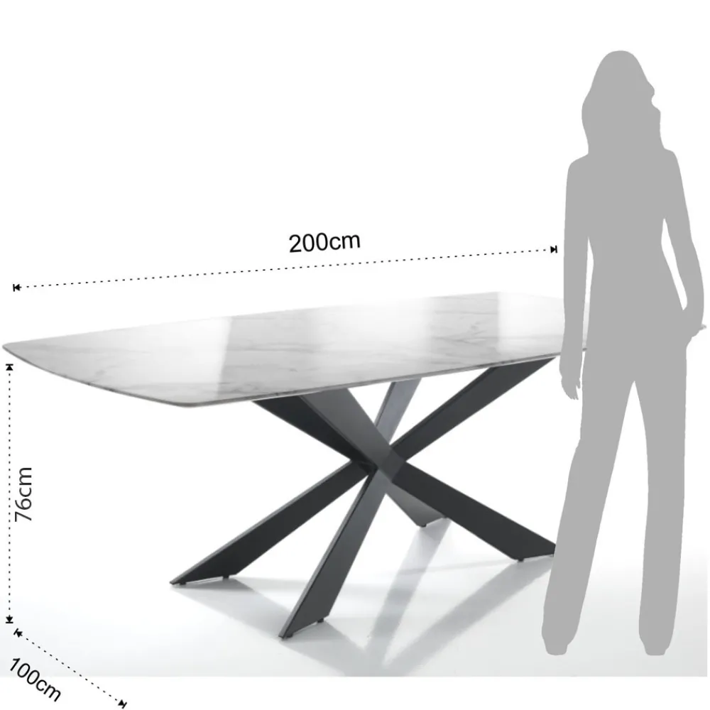 Tisch für den Innenbereich mit MDF-Platte, bedeckt mit Calacatta-Marmoreffekt . 15 mm und Sockel komplett aus mattschwarz lackiertem Metall .