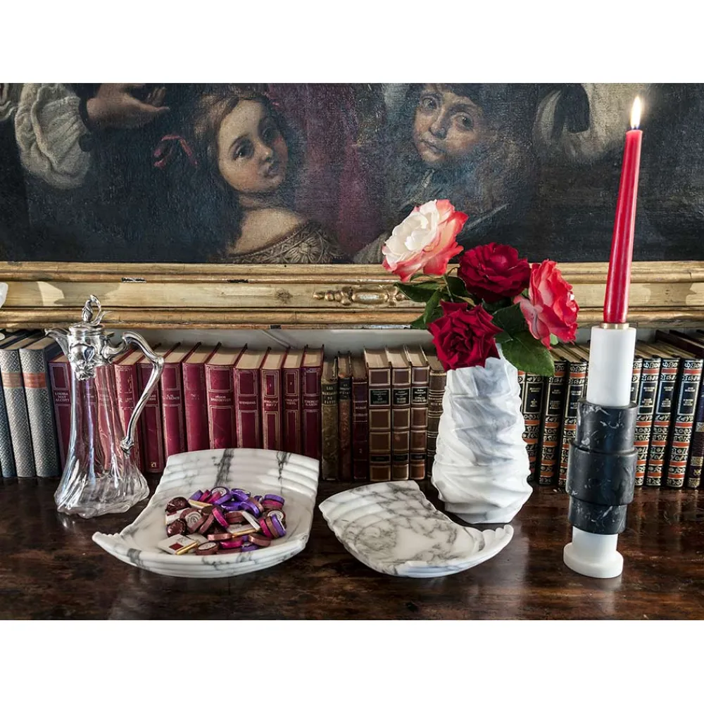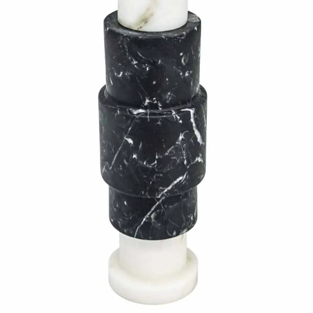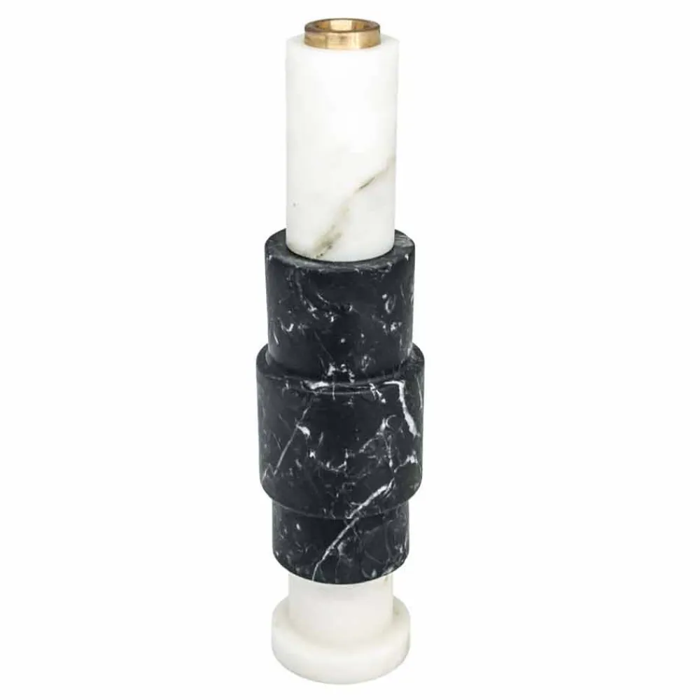 Kerzenhalter aus hochwertigem Marmor und Messing . Es ist als Unikat zu betrachten, da sich jeder verwendete Marmorblock von den anderen für Adern und Schattierungen unterscheidet. Der weiße Marmor stammt aus dem Steinbruch Poggio Silvestre, einer Quelle von Marmor erster Qualität, der seit dem letzten Jahrhundert klassifiziert wurde, während der schwarze Marquinia-Marmor aus spanischen Steinbrüchen gewonnen wird.