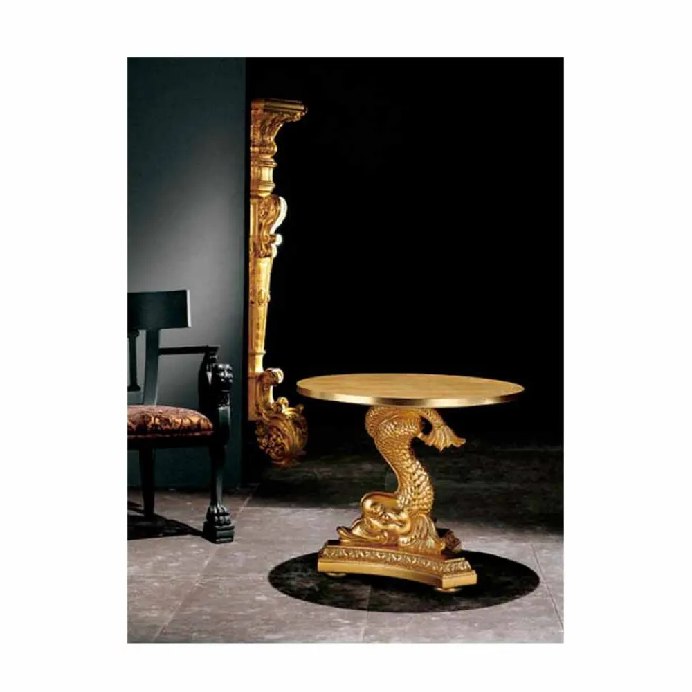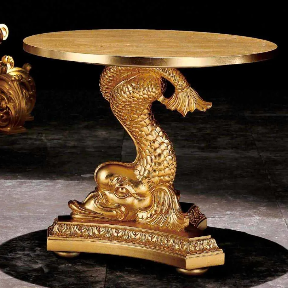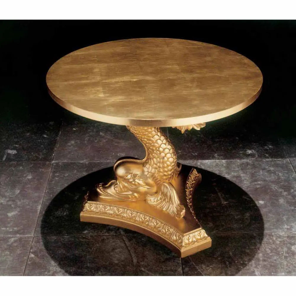 Die Struktur ist vollständig aus massivem Holz von Hand geschnitzt, die Oberseite ist rund. Das Finish aus patiniertem Blattgold trägt dazu bei, diesen in Italien hergestellten Designtisch weiter zu verschönern.