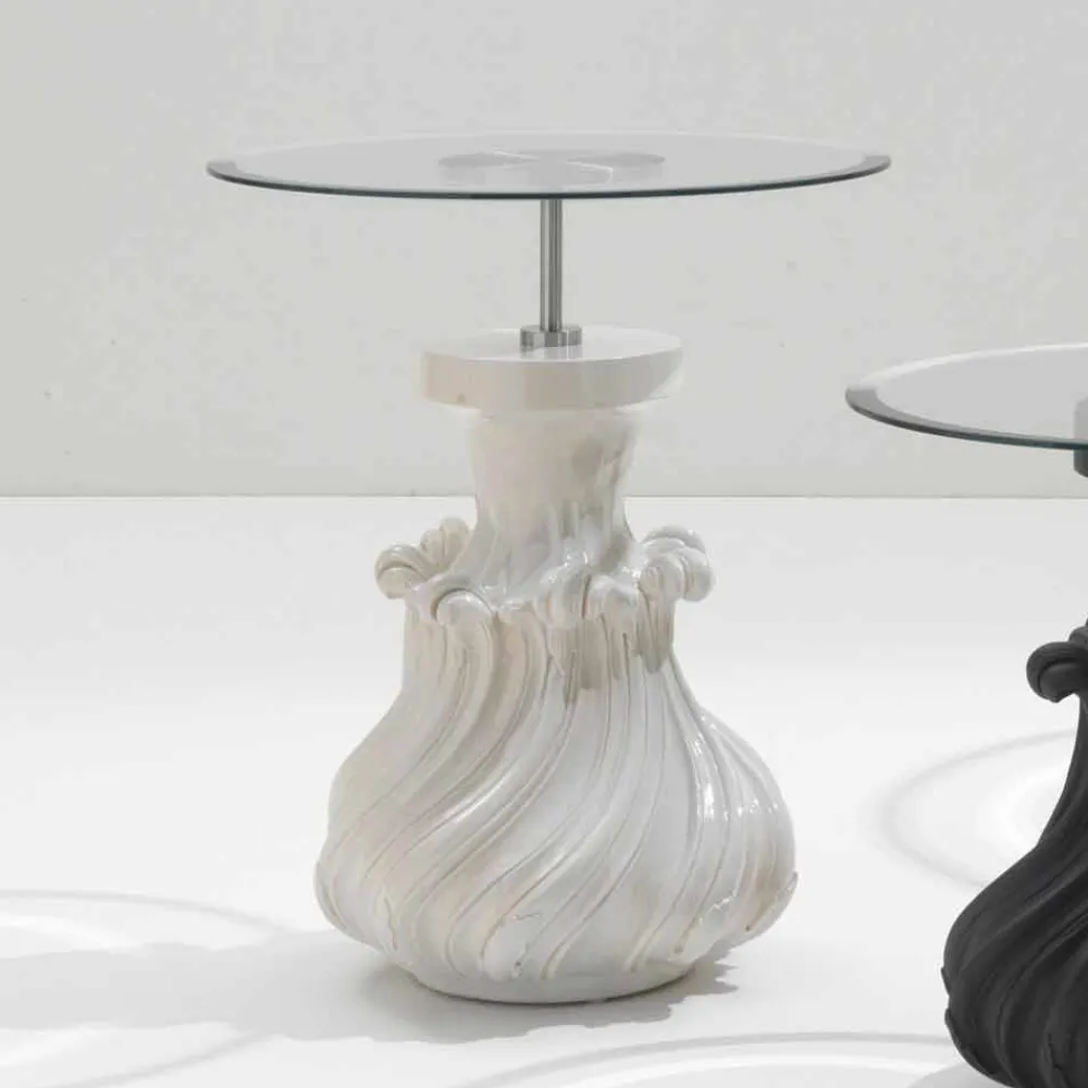 Cocktail-Tisch mit massivem Holzfuß von Hand geschnitzt. Top in geschliffenem Kristall mit 20 mm elektrogeschweißter Stahlplatte. Finishing verfügbar in Weiß glänzend (Anilinweiß lackiert).
