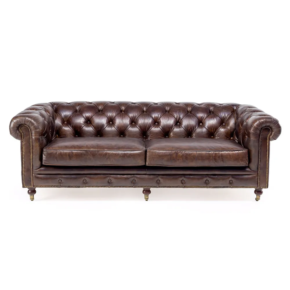 Wohnzimmersofa aus echtem dunkelbraunem Leder im klassischen englischen Stil.