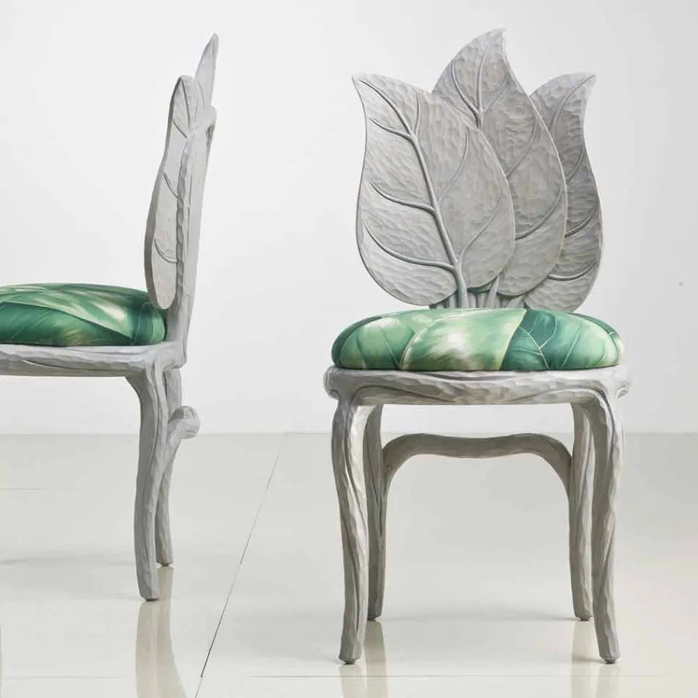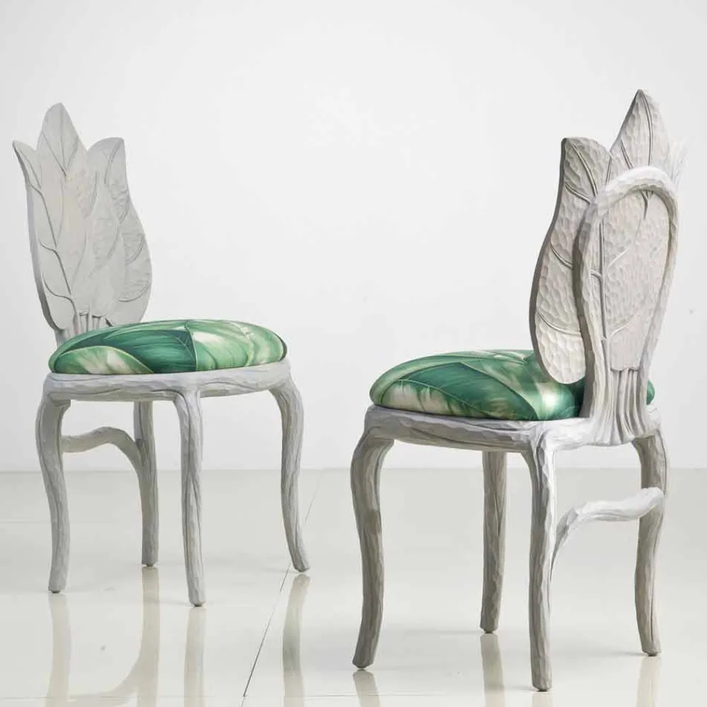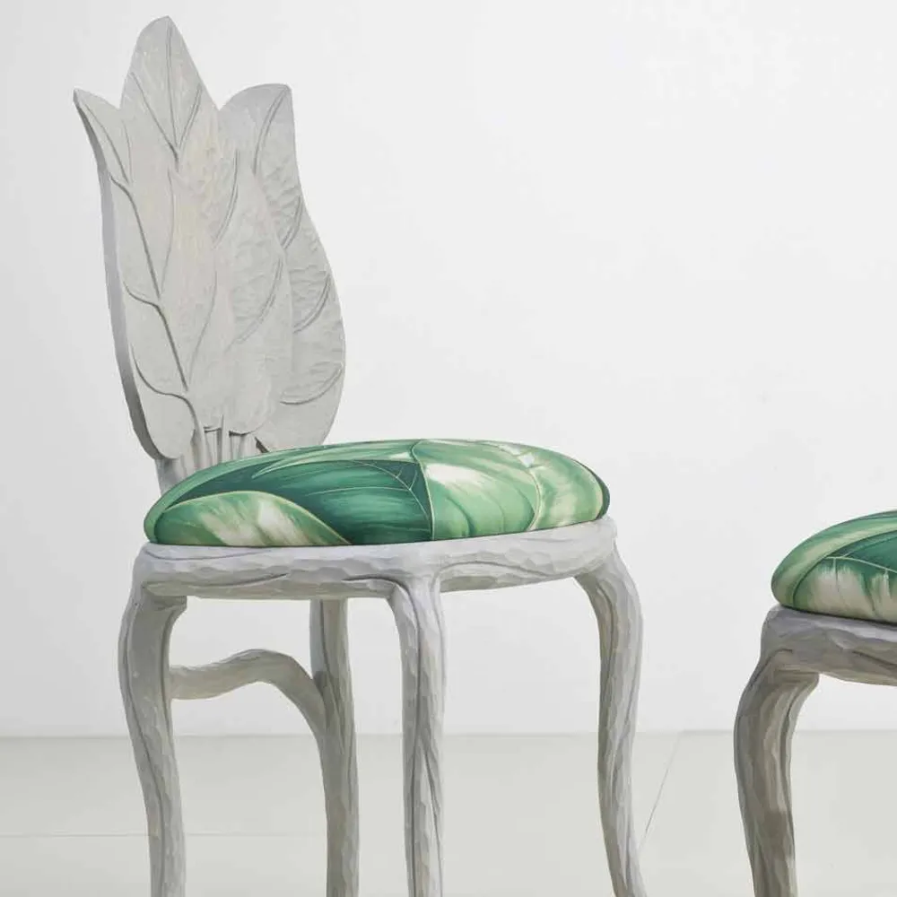Esszimmerstuhl mit Rückenlehne aus 3 geschnitzten Blättern, Sitz mit feuerfestem Gummi gepolstert. Die Struktur aus massivem Holz reproduziert die Formen eines in das Holz gehauenen Laubbündels, dessen Beine von dünnen Ästen innerviert werden, das gleiche Motiv, das vom Polsterstoff des Sitzes aufgenommen wird, in einer frischen Mischung aus Laub und energischen Farbtönen. Rauchgraues Finish.