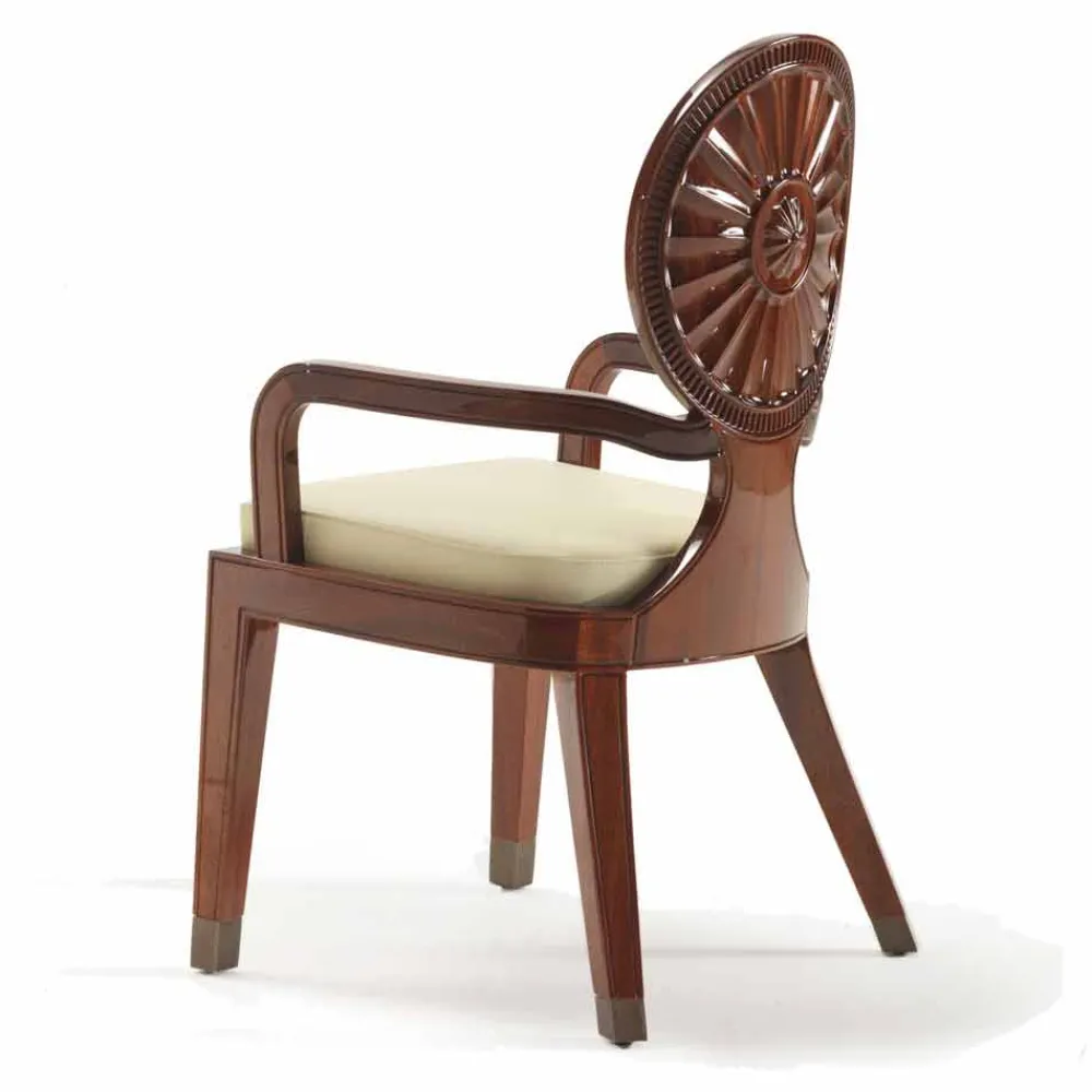 Esszimmerstuhl mit Armlehnen. Vordere Rückenlehne aus glattem Holz, Rückseite aus bearbeitetem Holz. Gepolsterter Sitz in Leder, Spitzen in bronziertem Messing. Finish in poliertem Mahagoni.