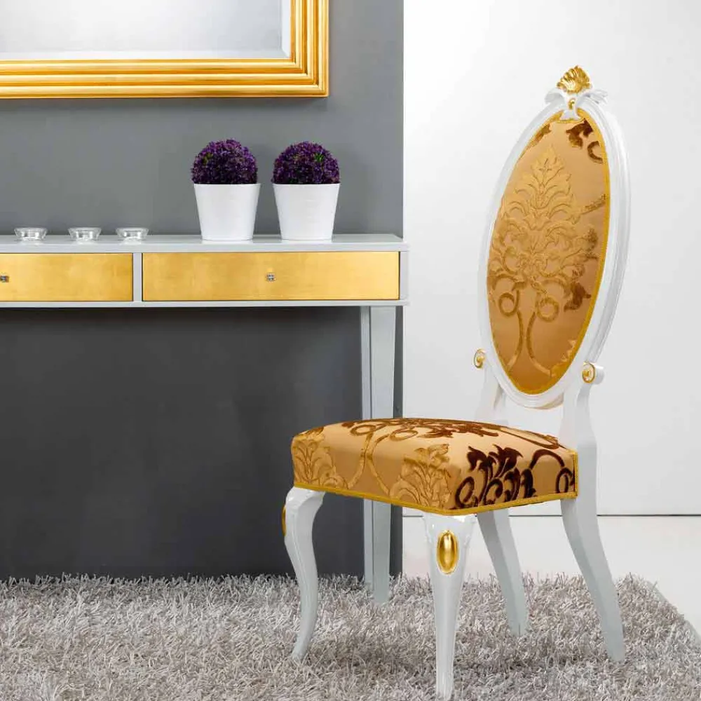 Der klassische Neobarock Stuhl in seiner pompösen und glanzvollen Ästhetik, eignet sich hervorragend für Liebhaber klassischer Einrichtungsmöbel. Ein eleganter Stuhl im New Baroque Style nach professionellen handwerklichen Kriterien hergestellt und von hoch ausgebildeten Designern entworfen. Hier treffen Sie auf einen Stil mit schwunghaften Linien und einer pompösen Gestalt, deren Inhalt die Errungenschaften der Revolution enthalten.