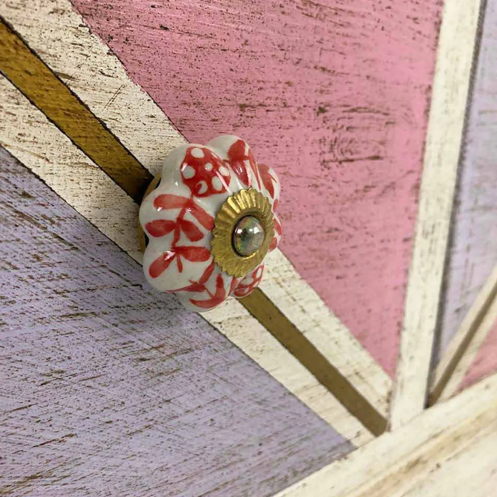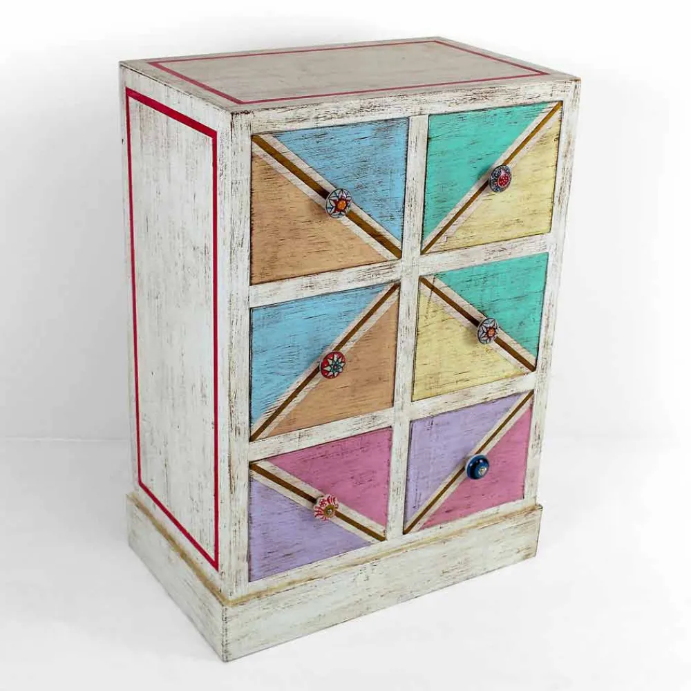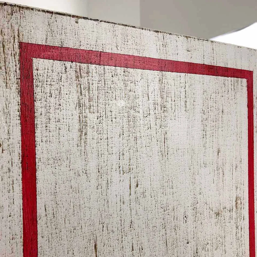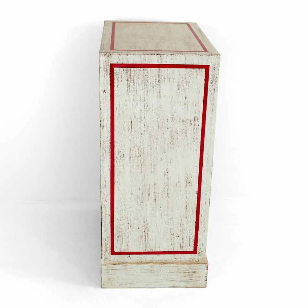 Kommode in Italien handgefertigt mit Struktur aus massivem Holz und weißem Finish und 6 Schubladen aus Pappelsperrholz mit diagonaler Holzfrontplatte und Details in antikem Gold und Rot. Das Produkt ist mit einer transparenten Oberfläche versehen, die es wasserabweisend macht und die Farben so fixiert, dass sie im Laufe der Zeit unveränderlich sind.