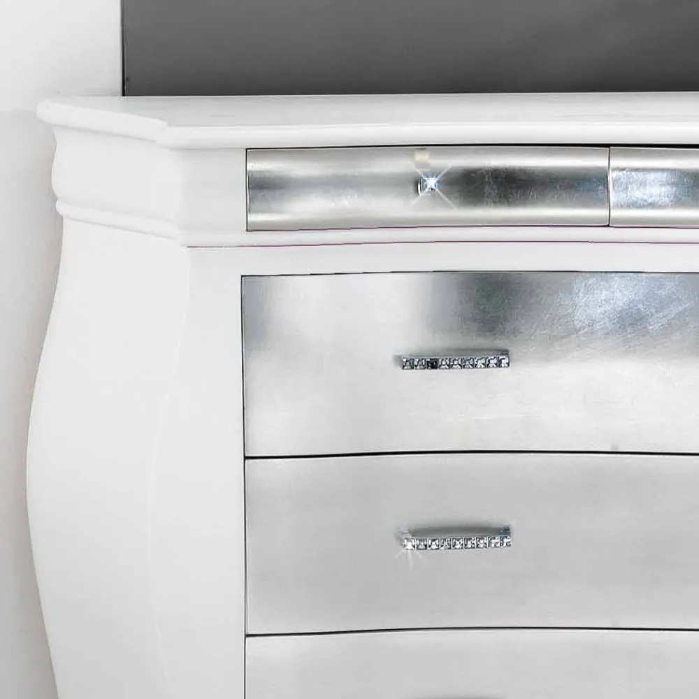 Das klassische Schlafzimmer Sideboard im rustikalen Stil aber zeitlosen Design aus geschwungenen und fein geschliffenen Massivholz , weiß lackiert mit Schubladen In Blattsilber. Das Sideboard ist mit 6 Schubladen ausgestattet, davon sind 3 flache Schubladen für Accessoires vorhanden und 3 räumlich große Schubladen, die für genügend Stauraum sorgen. Made in Italy. Die Schubladen sind in Blattsilber oder Blattgold erhältlich.