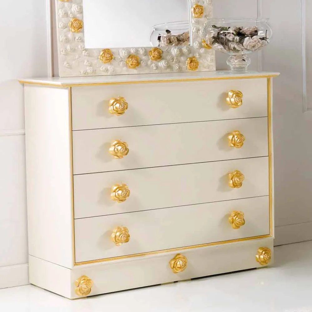 Die Kommode Renoir im neoklassischen Stil liefert mit 4 Schubladen genügend Stauraum um Ordnung zu schaffen. Die Schlafzimmer Kommode in Ihrem antique creme patinee Finish und dem vergoldeten Schubladengriffen in Rosenoptik liefert einen atemberaubenden Elite Stil der Klassik. Bei dieser Kommode handelt es sich um ein in Handarbeit gefertigtes Produkt, dass mit viel Liebe zum Detail geschaffen wurde und einen Hauch von mediterraner Klassik verbreitet.