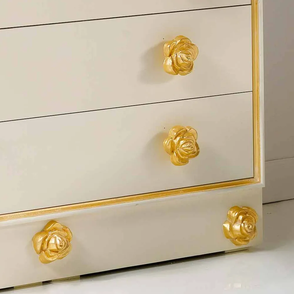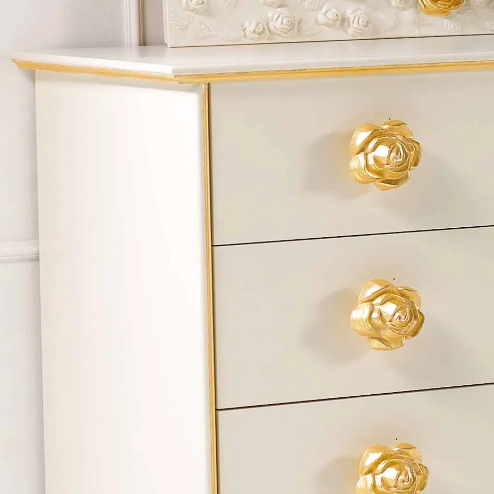 Die im klassischen Stil gehaltene Kommode präsentiert sich in einem typisch französichen antique creme patinee Finish und vergoldeten Schubladenknöpfen in Rosenoptik.