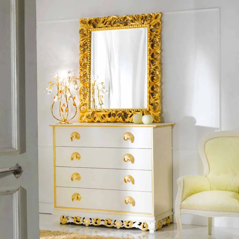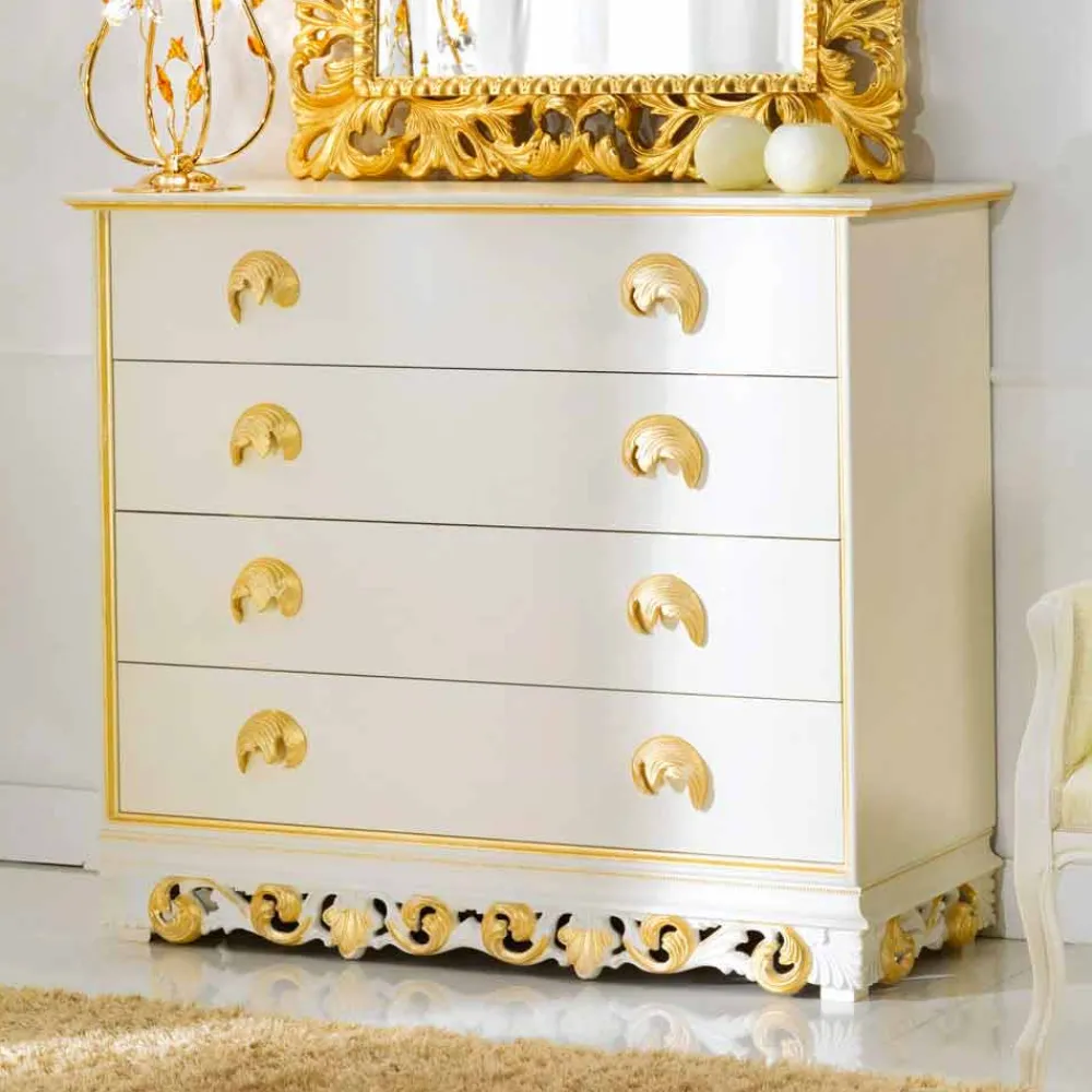 Eine stilvolle Schlafzimmer Kommode, für diejenigen die es rustikal oder klassisch mögen. Toskanische Einrichtungsgegenstände im originalen Barock Stil. Es handelt sich bei der Kommode um ein in Handarbeit gefertigtes Produkt, dass mit viel Liebe zum Detail geschaffen wurde und einen Hauch von mediterraner Romantik verbreitet. Die Struktur besteht aus hochwertigen Holz und verschafft mit seinen 4 Schubladen für ausreichende Stauraummöglichkeiten. Die Scharnieren der Schubladen besitzen einen innovativen Schließmechanismus mit Dämpfungssystem, diese bilden die Basis für ein geräuschloses und sanftes Schließen. Das Oberflächenfinish in antique creme patinee mit vergoldeten Schubladengriffen und prunkvollen Verzierungen versehen, verleiht dieser Kommode einen französisch barocken Stil.