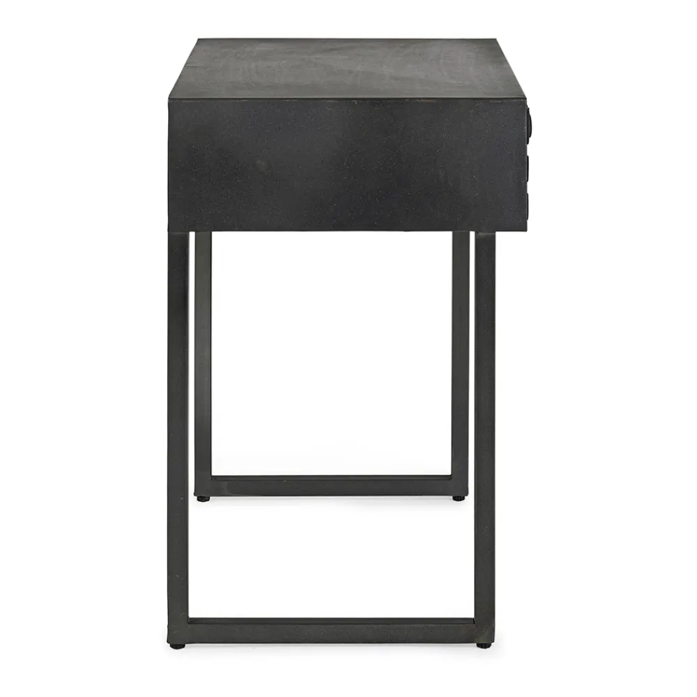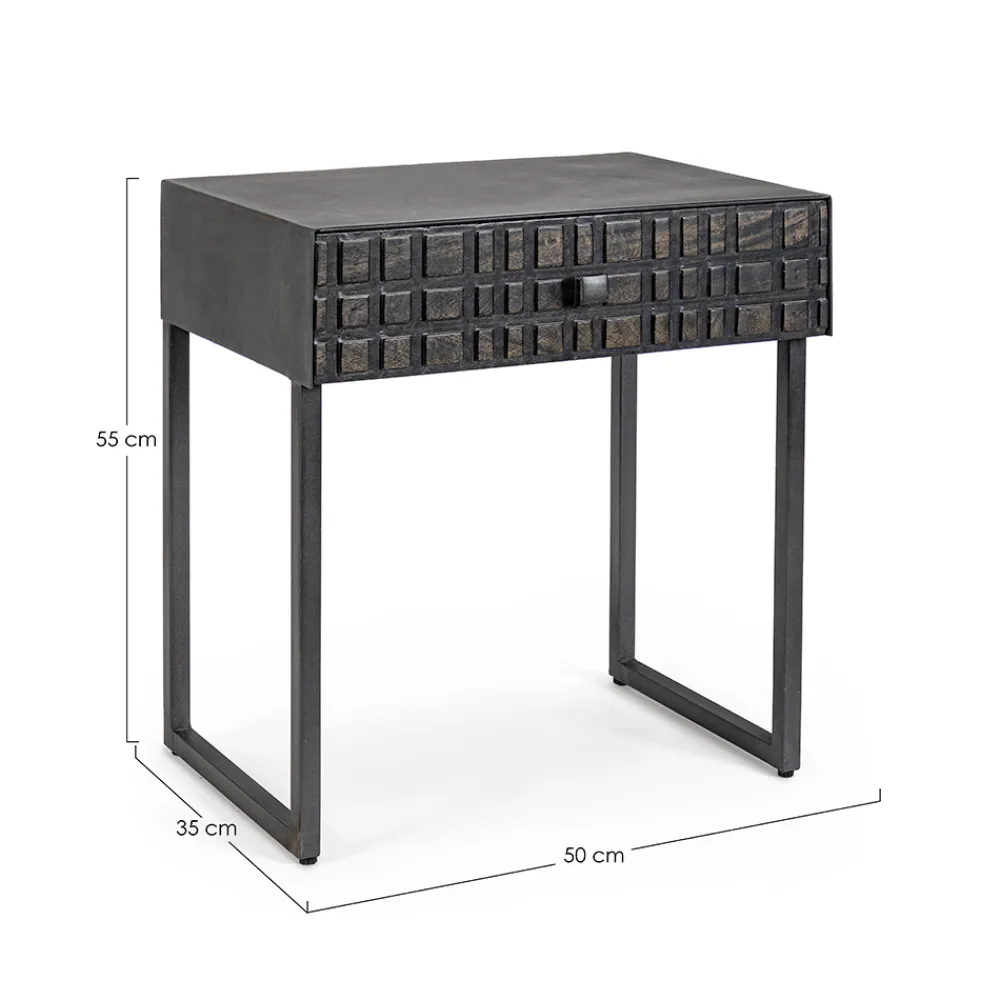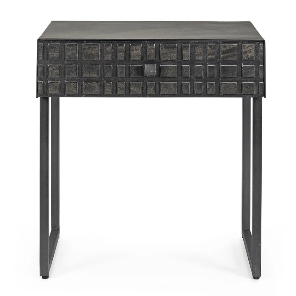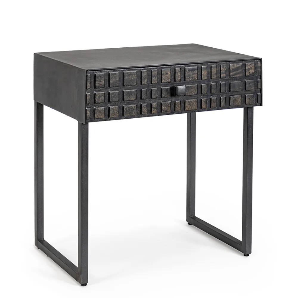 Nachttisch aus Stahl mit Schublade aus Mangoholz im ethnischen Design.