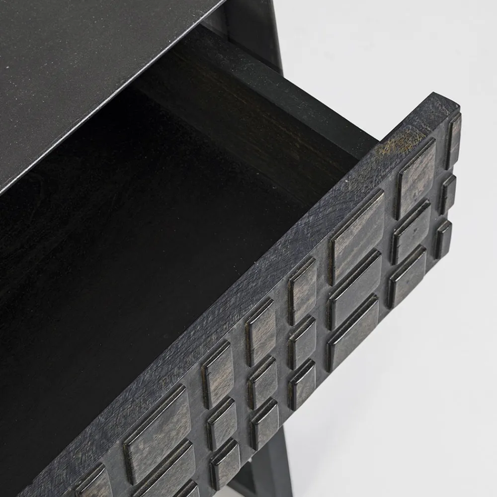 Die Schublade und die Tür bestehen aus Mangoholz mit einer Oberfläche auf Nitrozellulosebasis.