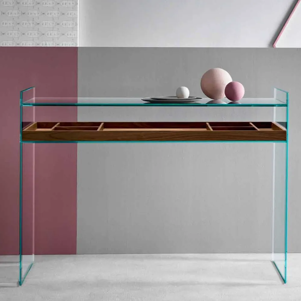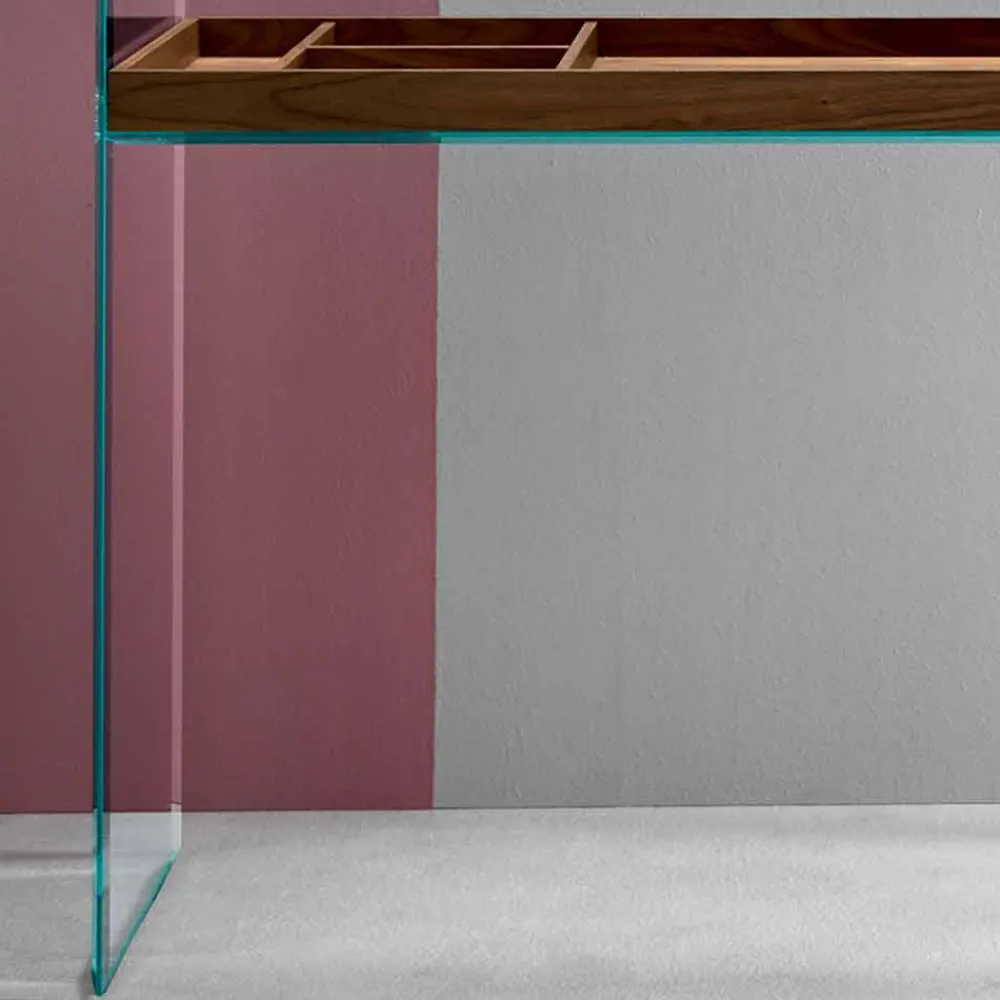 Moderner Konsolenschreibtisch in Italien von Hand aus extraklarem Glas mit Tablett aus Massivholz.