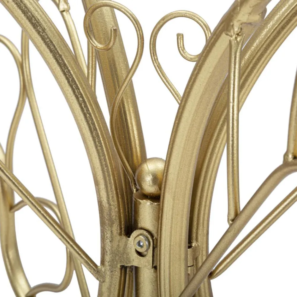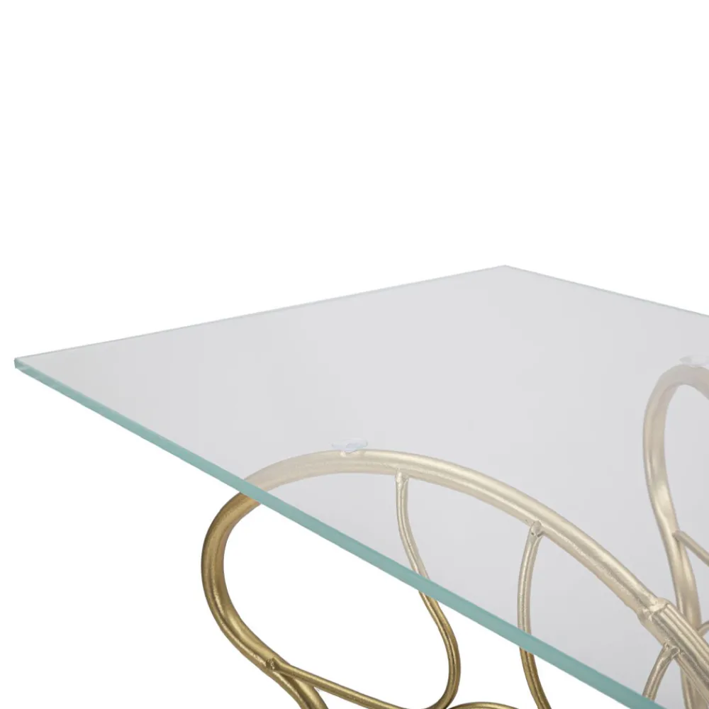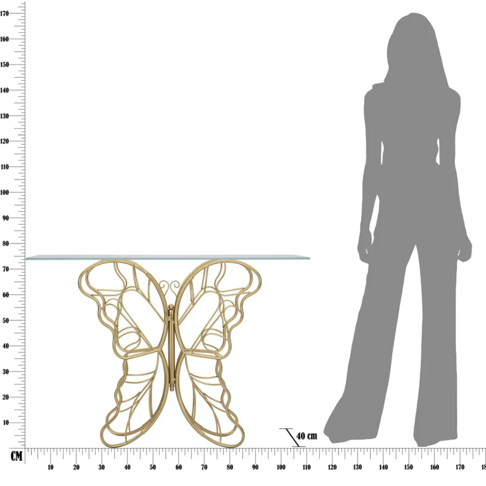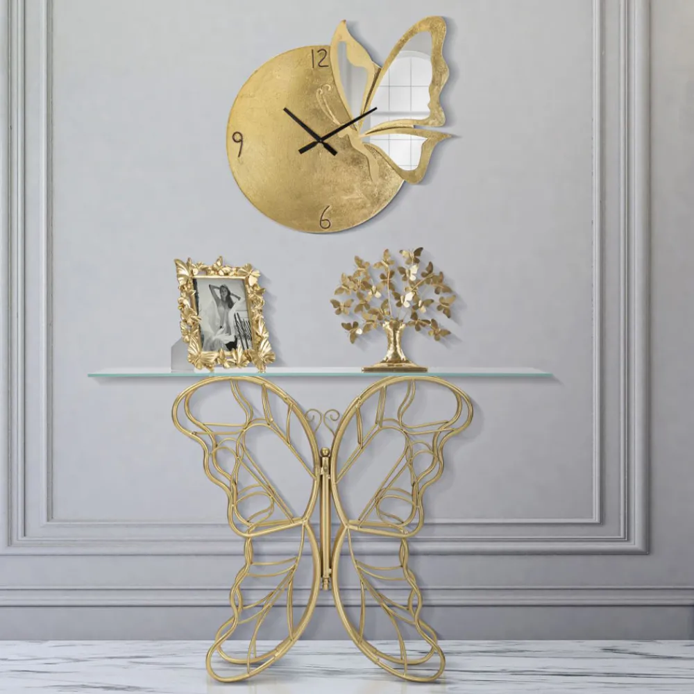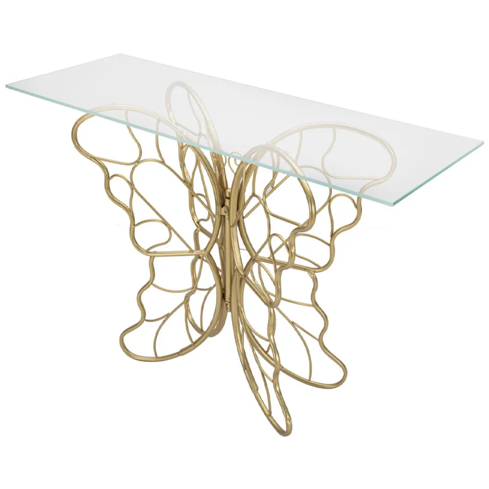 Moderne feste Konsole mit goldener Eisenstruktur und transparenter Glasplatte . Ästhetik und Funktionalität vereinen sich zu einem originellen Einrichtungsaccessoire mit romantischer Seele, das sich durch die besondere Formgebung des Sockels auszeichnet, der die elegante Form eines Schmetterlings nachbildet und so das endgültige Design des Produkts bereichert. Die perfekte Kombination aus dem goldenen Finish des Sockels und dem raffinierten Touch der Glasplatte macht diese Konsole zu einem idealen Dekorationselement für alle, die einen kreativen Stil suchen und ihre Wohnräume gerne mit Objekten mit einer starken, raffinierten Persönlichkeit ausstatten.