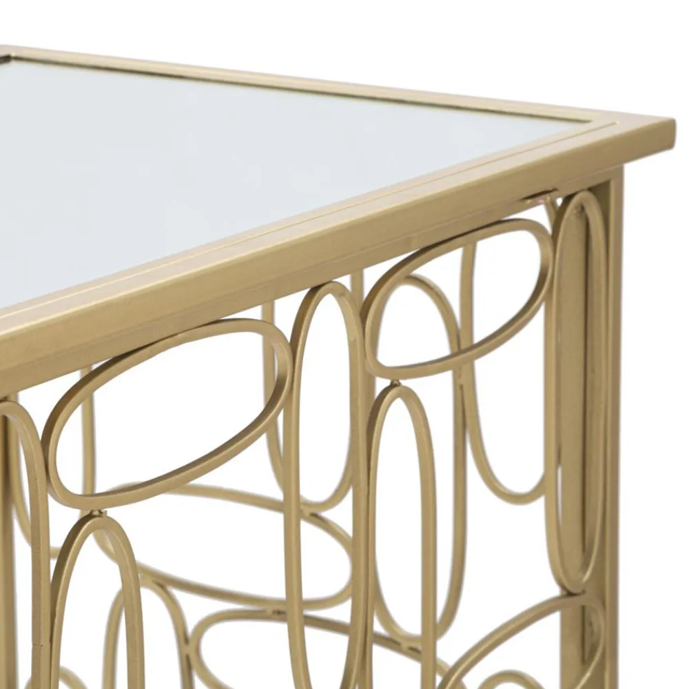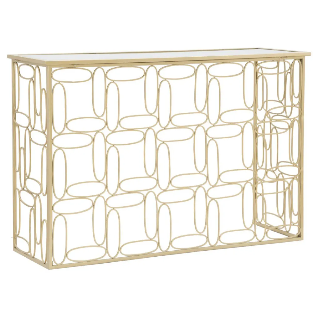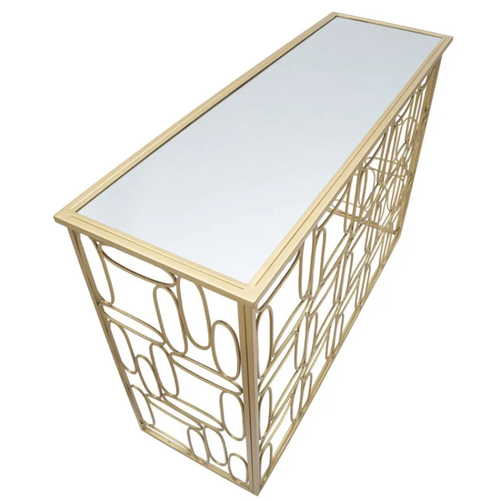 Eingangs- oder Wohnzimmerkonsole mit goldfarbener Eisenstruktur und rechteckiger Spiegelplatte . Ein elegantes und modernes Möbelstück , einzigartig durch die besondere Basis, die geometrische Linien und Formen verwendet, um die Ästhetik des Produkts zu bereichern und eine exklusive Note zu verleihen. Das Ergebnis ist eine raffinierte und funktionale Konsole , die sich dank ihrer Vielseitigkeit und ihres zeitgenössischen Charakters an jede stilistische Situation anpassen kann.