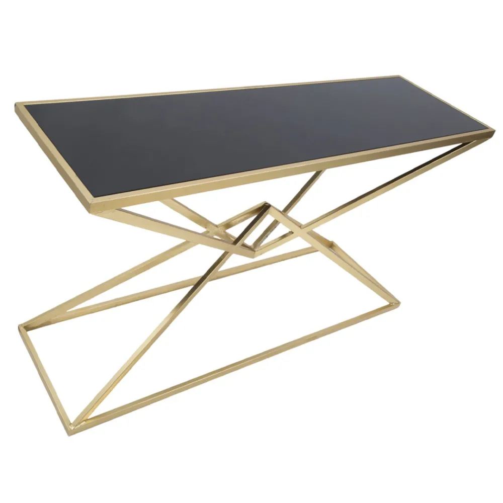 Feste rechteckige Konsole mit Struktur aus Eisen mit Goldfinish mit schwarzer Glasplatte . Eine elegante und stilvolle Einrichtungslösung, die sich durch eine besondere Basis auszeichnet, die geometrische Linien und verschiedene Formen verwendet, um die Ästhetik des Produkts zu bereichern und eine einzigartige und exklusive Note zu verleihen. Das Ergebnis ist eine raffinierte und avantgardistische Konsole , die sich dank ihrer Vielseitigkeit und ihres zeitgenössischen Charakters jeder modernen stilistischen Situation anpassen kann.