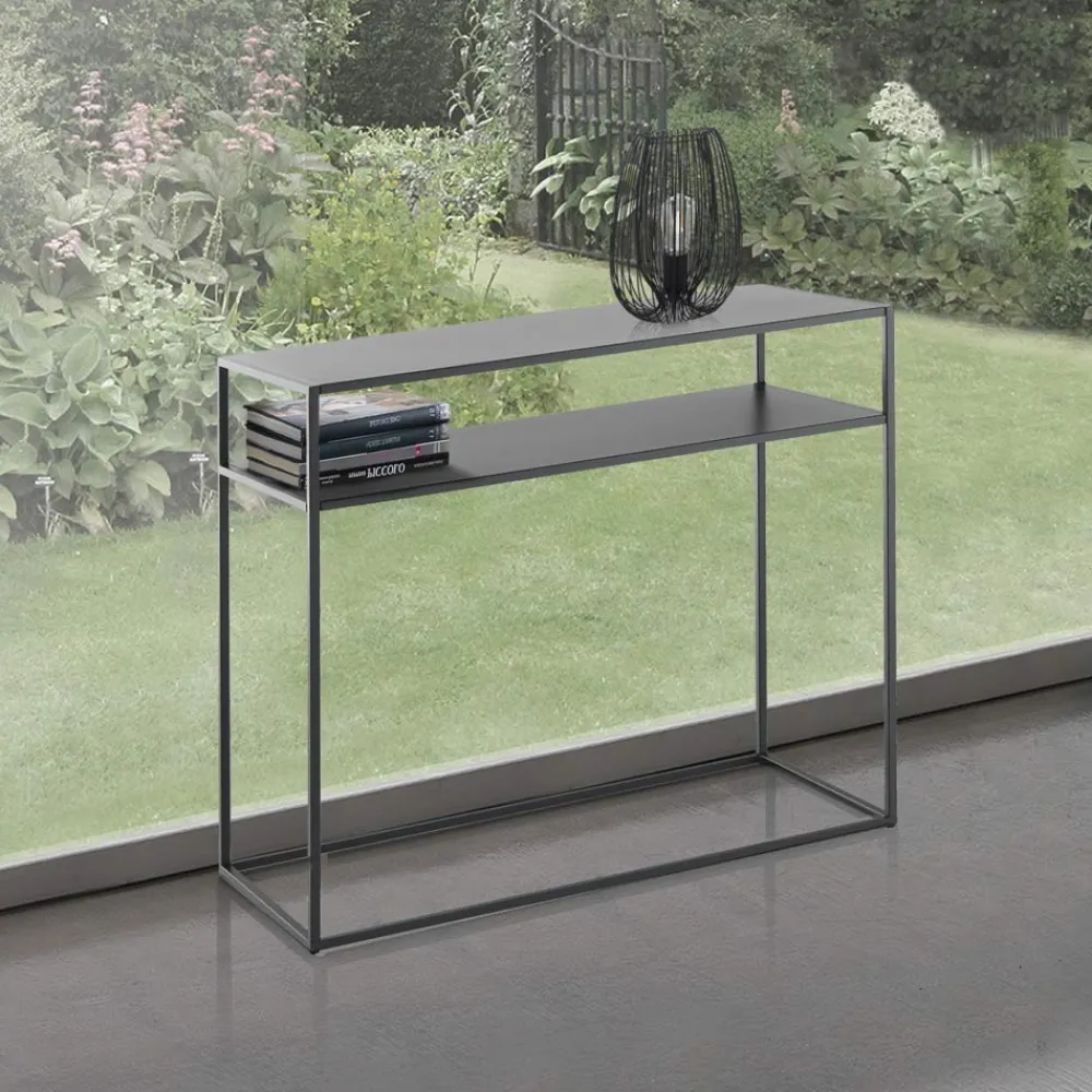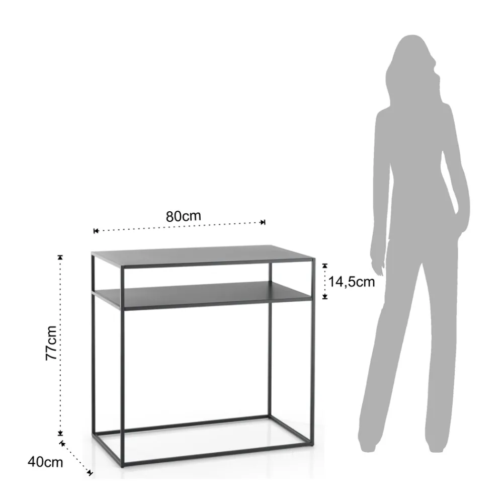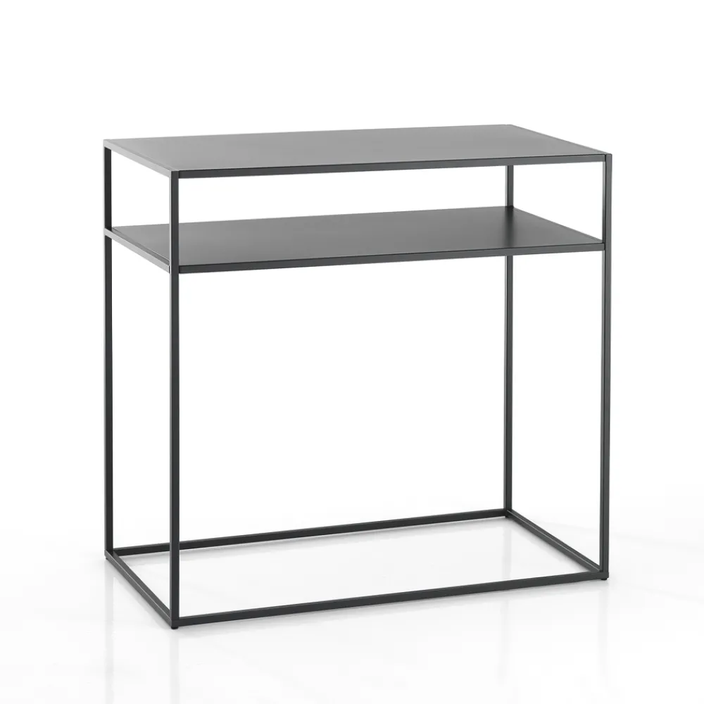 Konsole mit 13 x 13 mm Struktur aus matt anthrazit lackiertem Stahl und 1,5 cm hoher Platte und Ablage aus 1 mm dickem, matt anthrazit lackiertem Stahl .