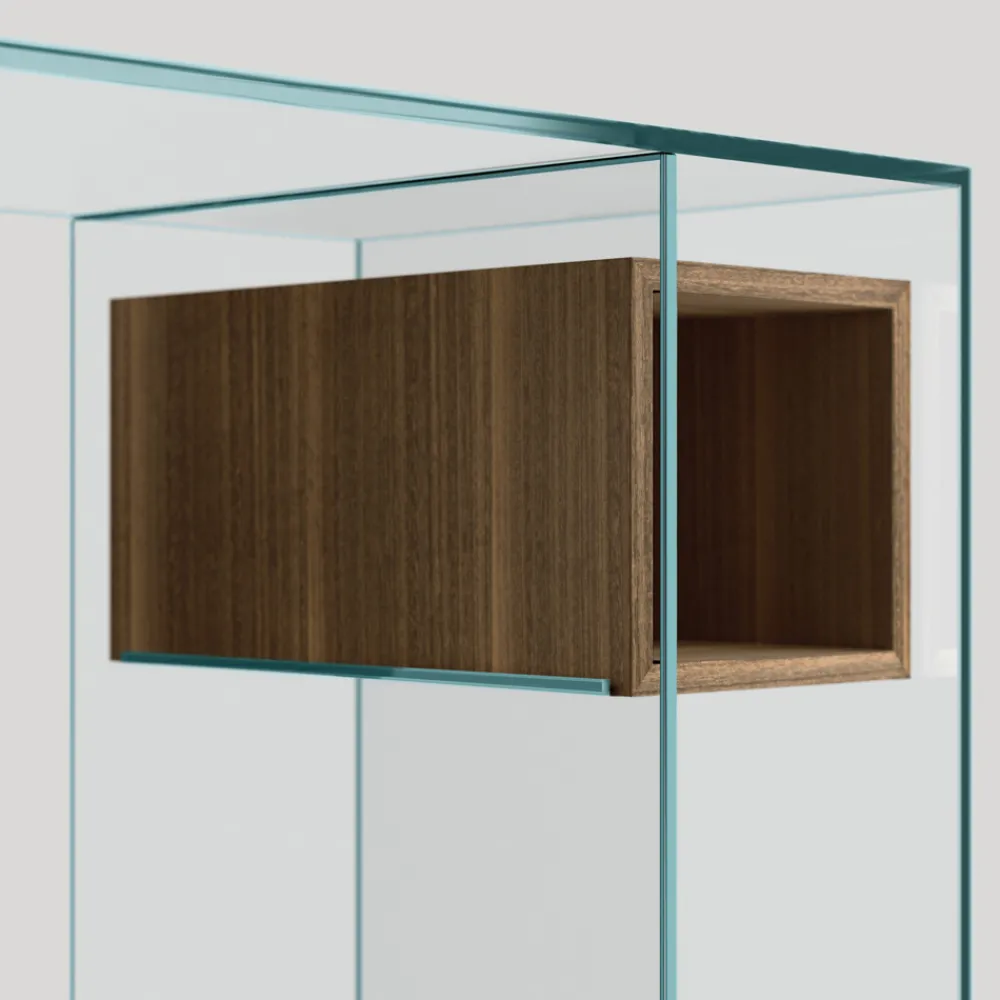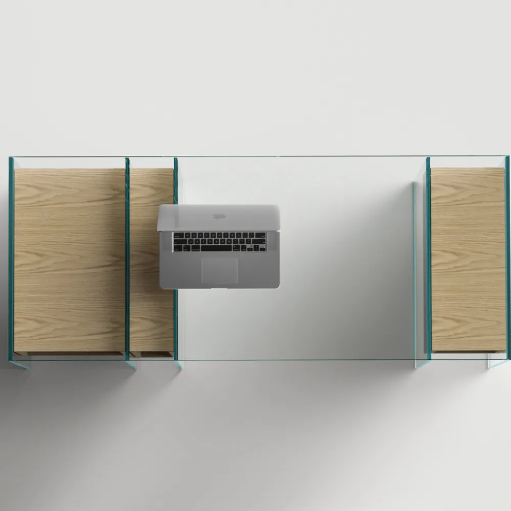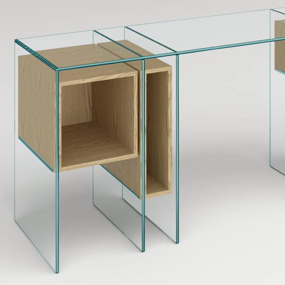 Schreibtischkonsole aus extraklarem Glas mit Holzdetails Made in Italy.