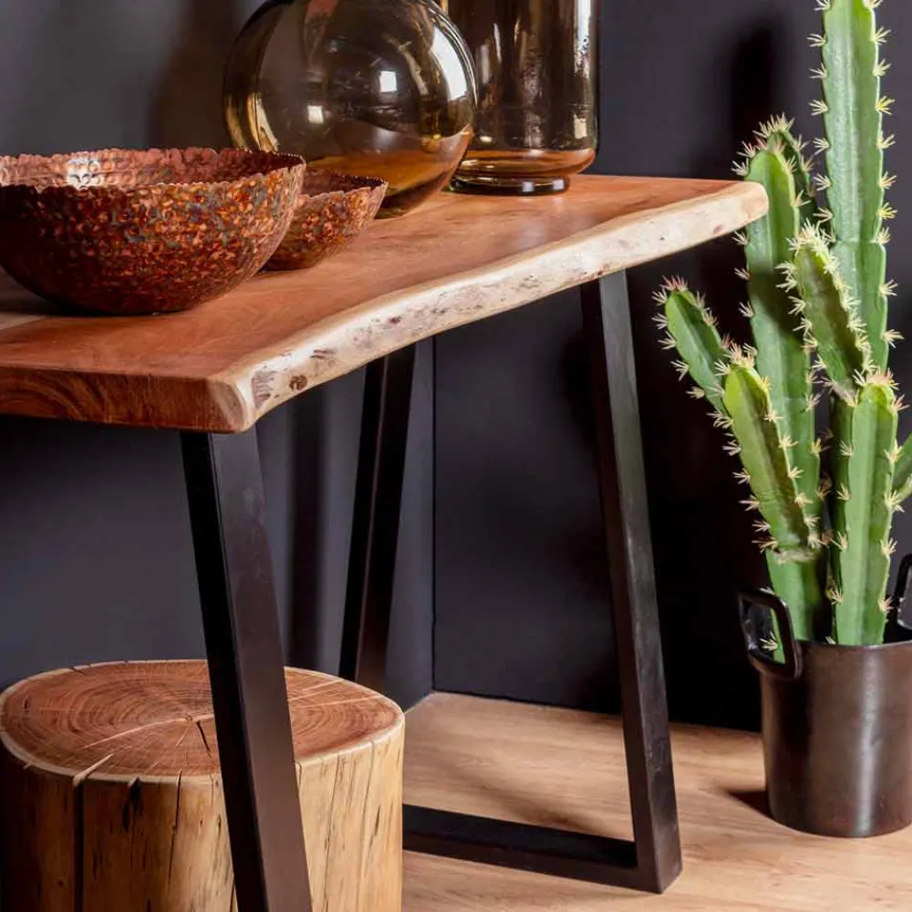 Konsolentisch im modernen Design mit handgefertigter Akazienholzplatte und Stahlbeinen.