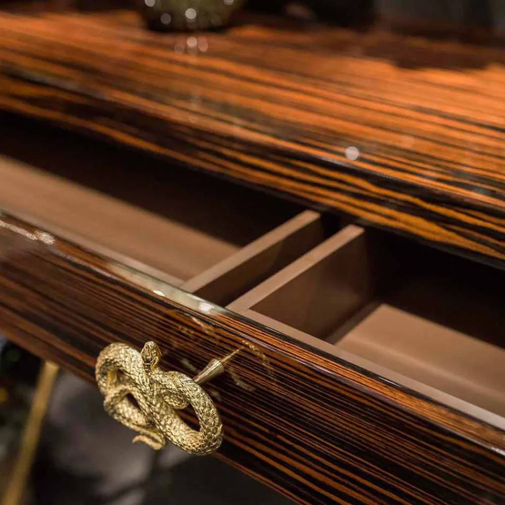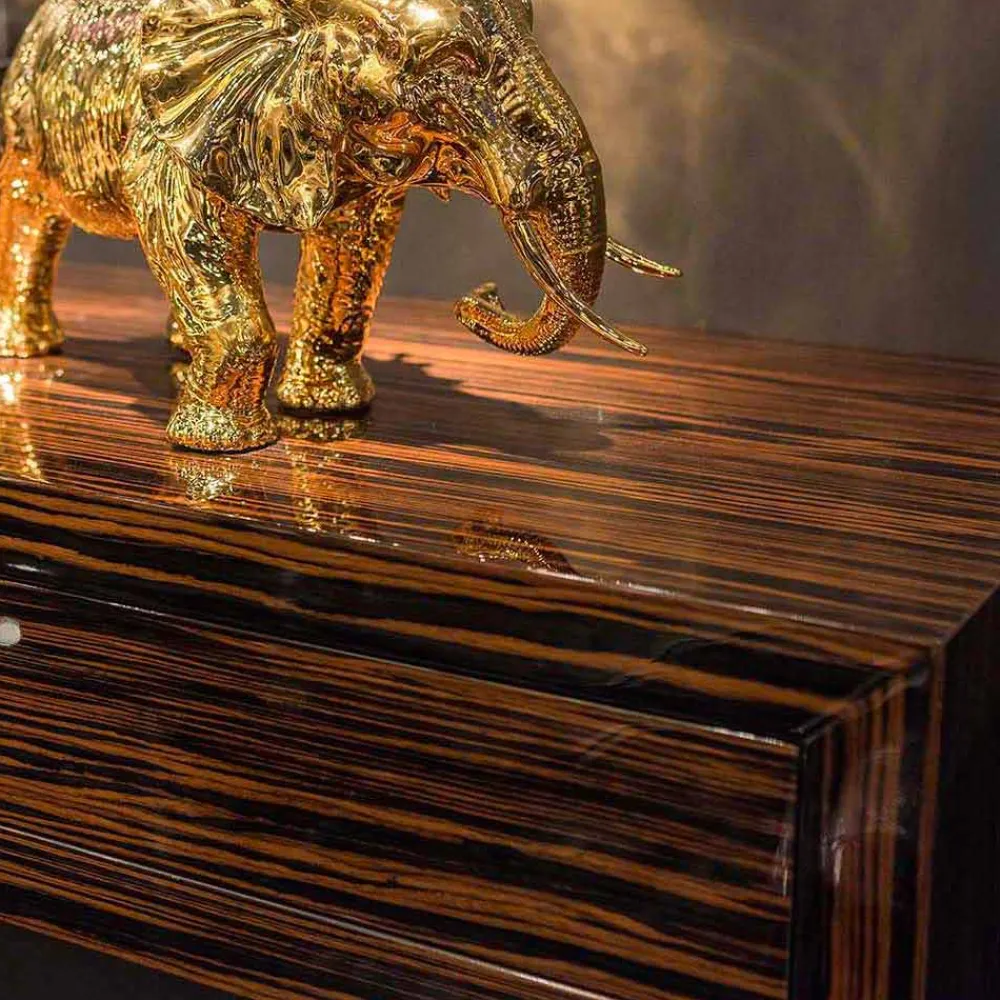 Ada 4 ist aus glänzendem Ebenholz oder weißem Perlmutt, 45°-Verbindung. Mit zwei Innenschubladen und Salice-Scharnieren mit Soft-Close-Funktion. Front mit Griff aus Messing schmelzen, Goldfarbe.