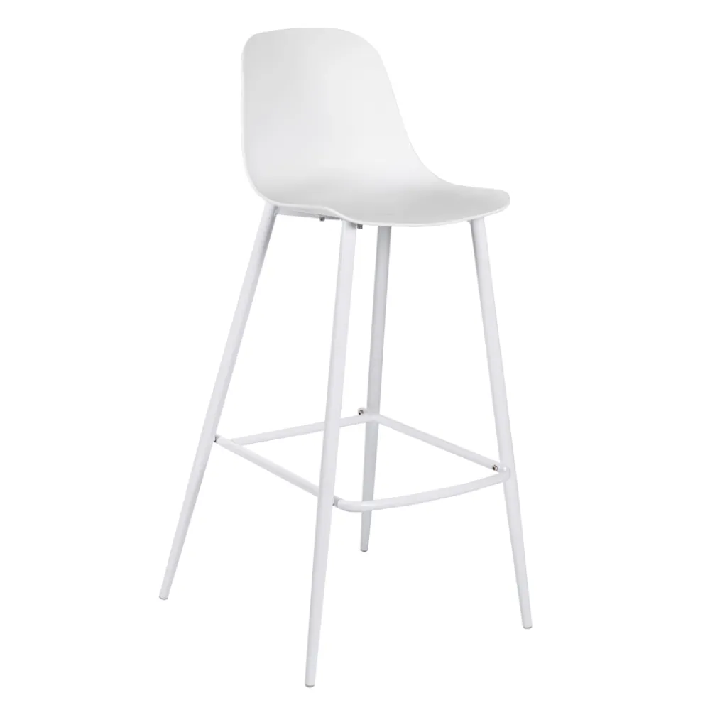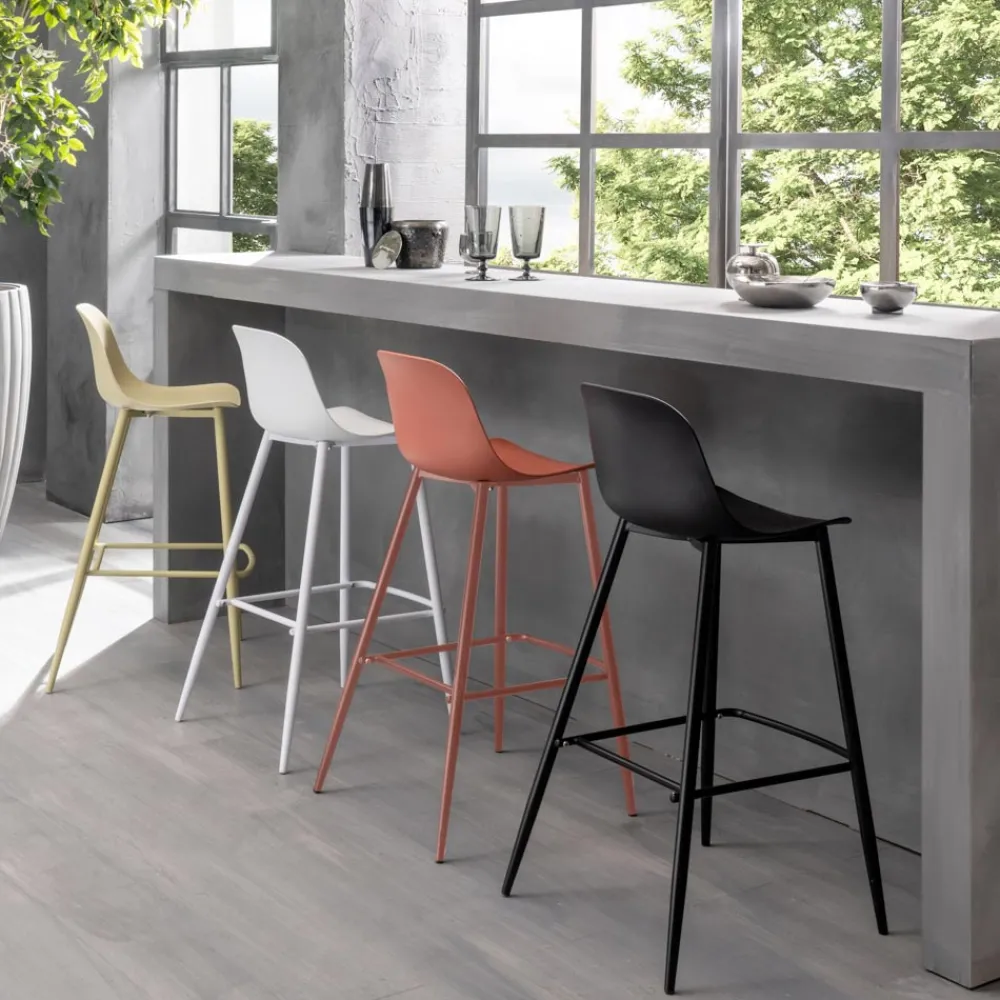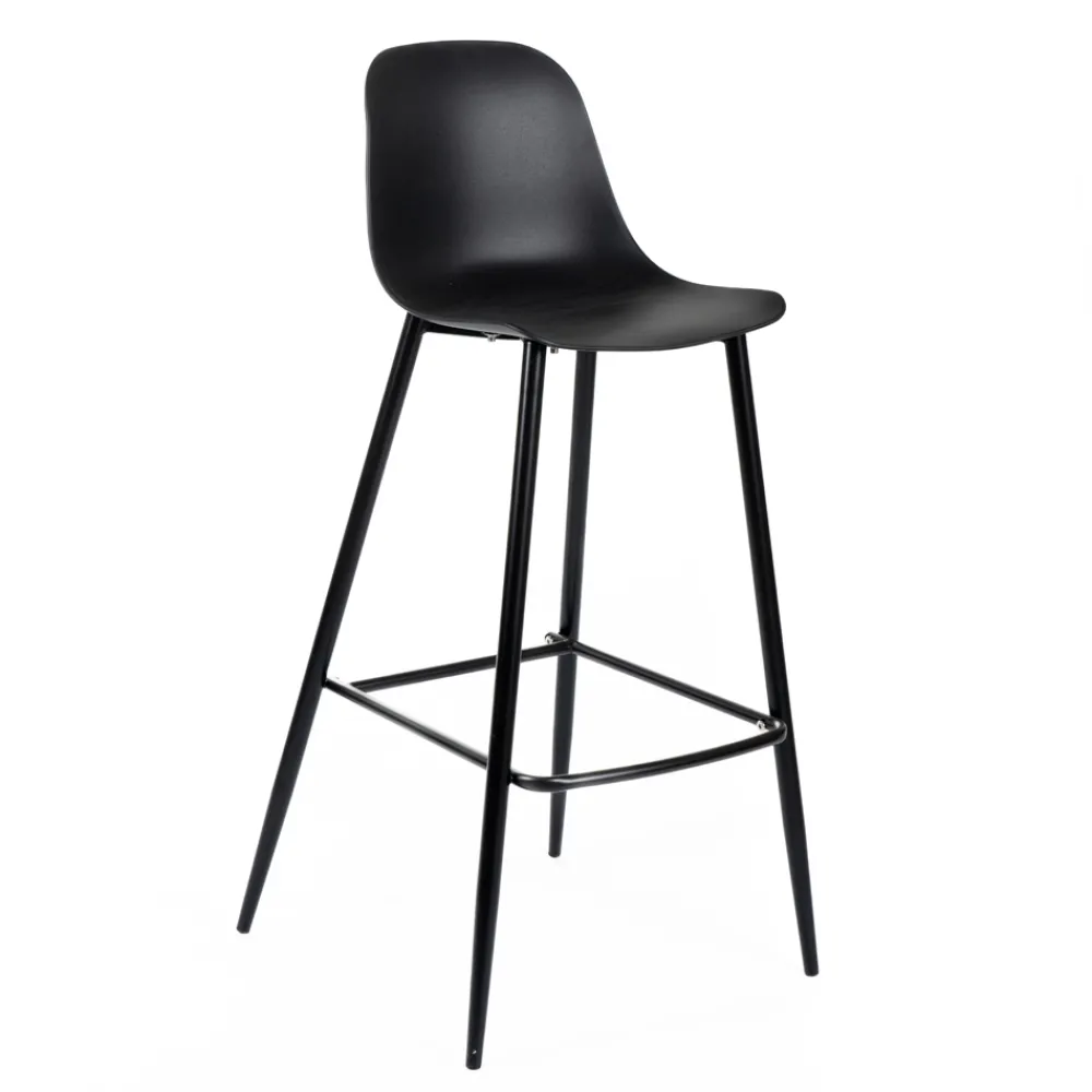 Dieser Hocker möchte die Form des traditionellen Esszimmerstuhls annehmen, übersetzt seine Form jedoch in etwas ausgesprochen Einzigartiges. Der Sitz ist bequem und bequem, während die in die Struktur integrierte Fußstütze für mehr Komfort sorgt. Dadurch eignen sich diese Möbel ideal für eine moderne offene Küche mit Halbinsel oder für einen Wohnbereich mit Bartresen.