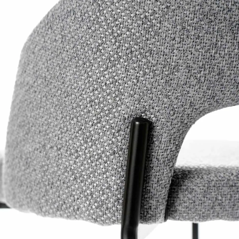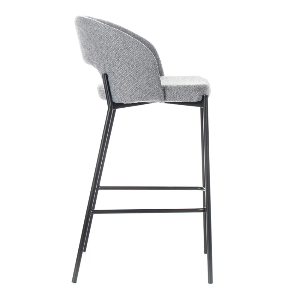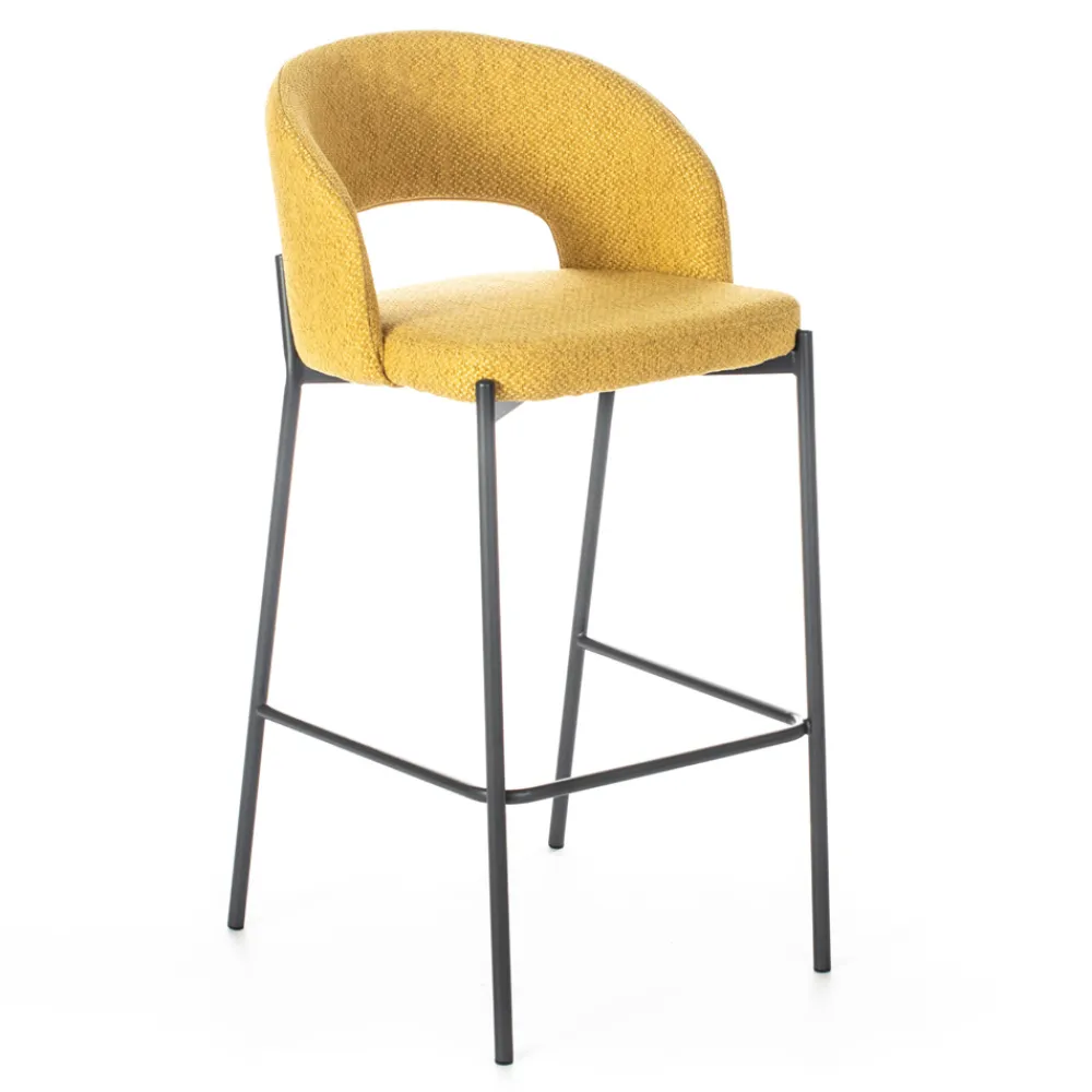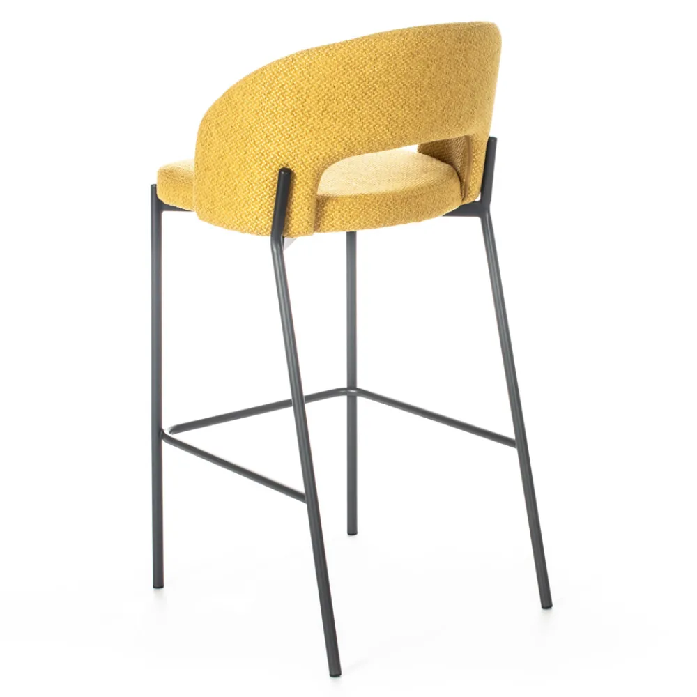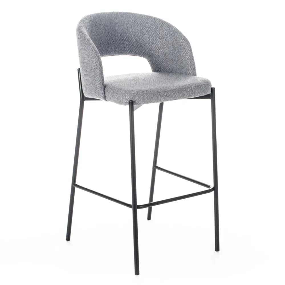 Dieser Hocker möchte die Form des traditionellen Esszimmerstuhls annehmen, übersetzt seine Form jedoch in etwas ausgesprochen Einzigartiges. Rückenlehne und Sitzfläche sind beide mit weichem Stoff bezogen, während die in die Struktur integrierte Fußstütze für mehr Komfort sorgt. Dadurch eignen sich diese Möbel ideal für eine moderne offene Küche mit Halbinsel oder für einen Wohnbereich mit Bartresen.