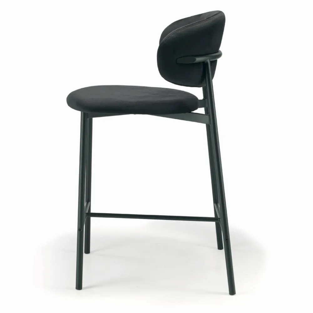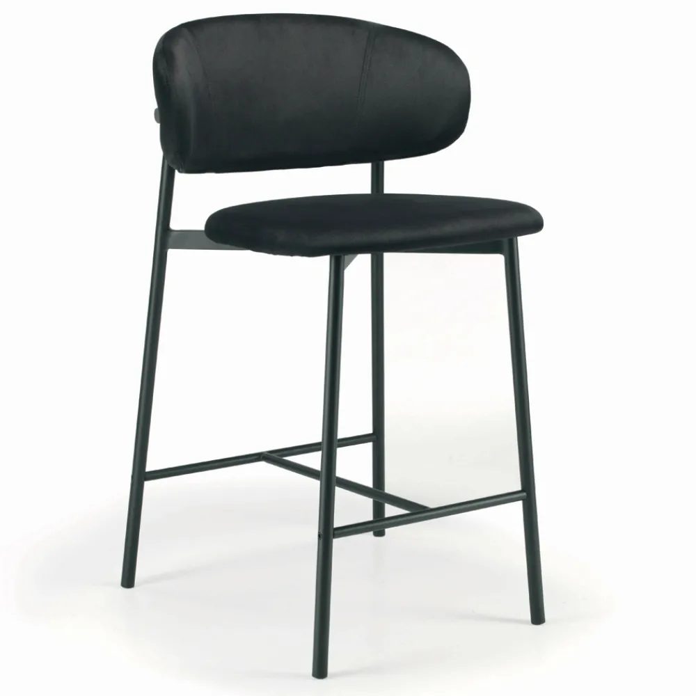 Fester Wohnzimmerhocker mit Sitz und Rückenlehne aus vollständig bezogenem Stahl und Untergestell aus schwarz lackiertem Stahl.