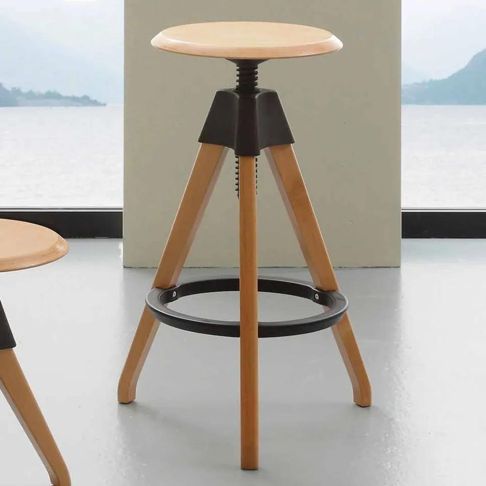 Der Hocker ist aus Buchenholz hergestellt mit schwarzen Polypropylen-Elementen.