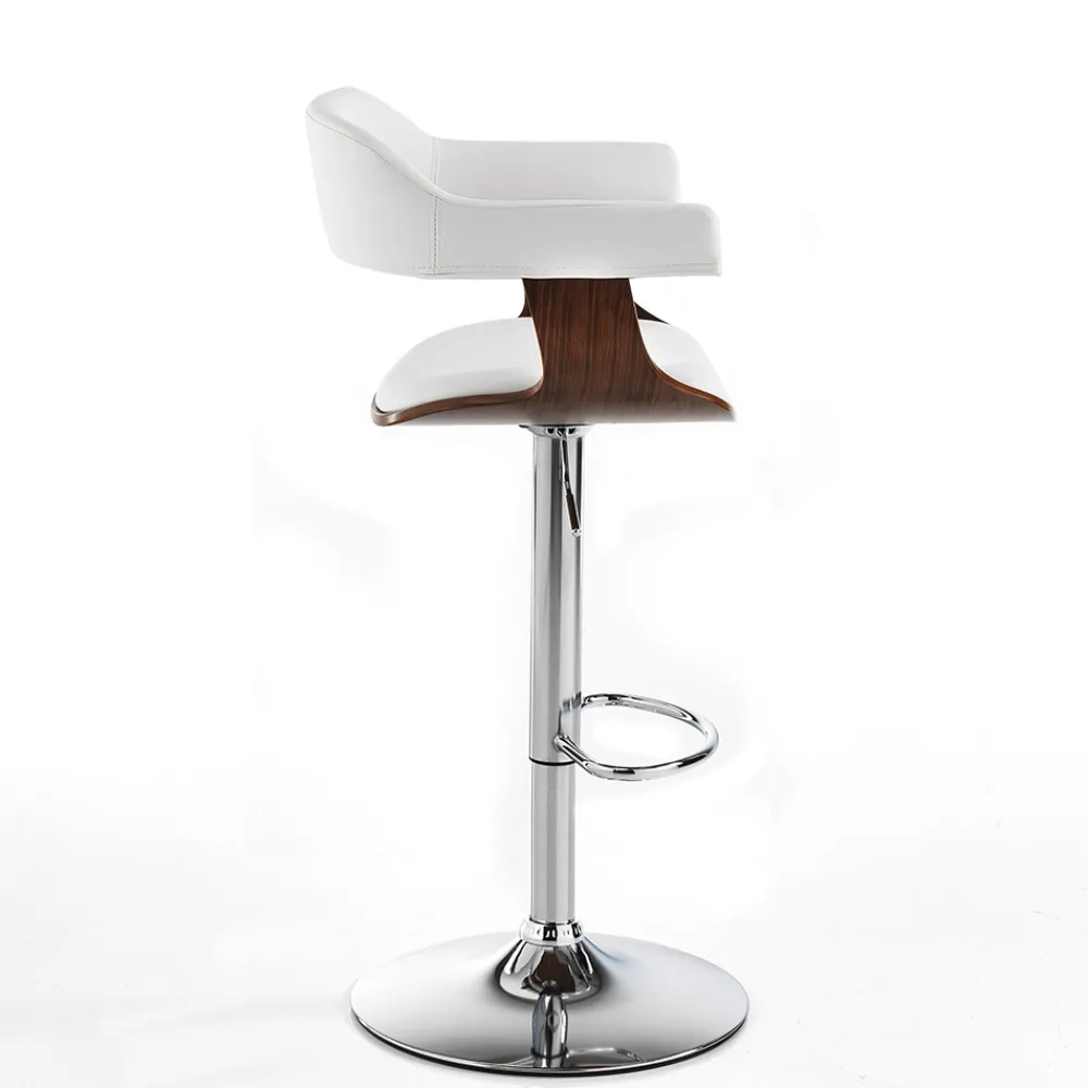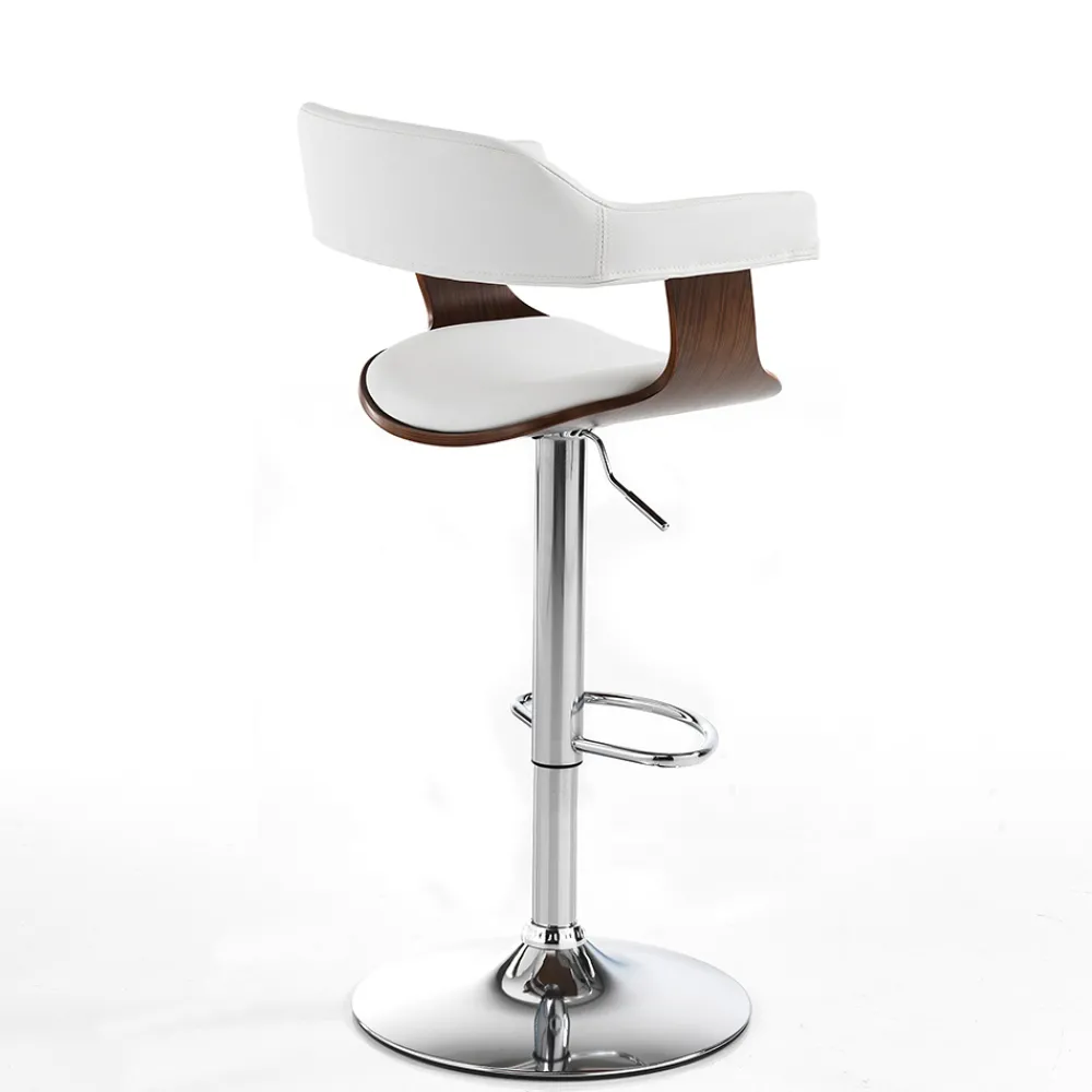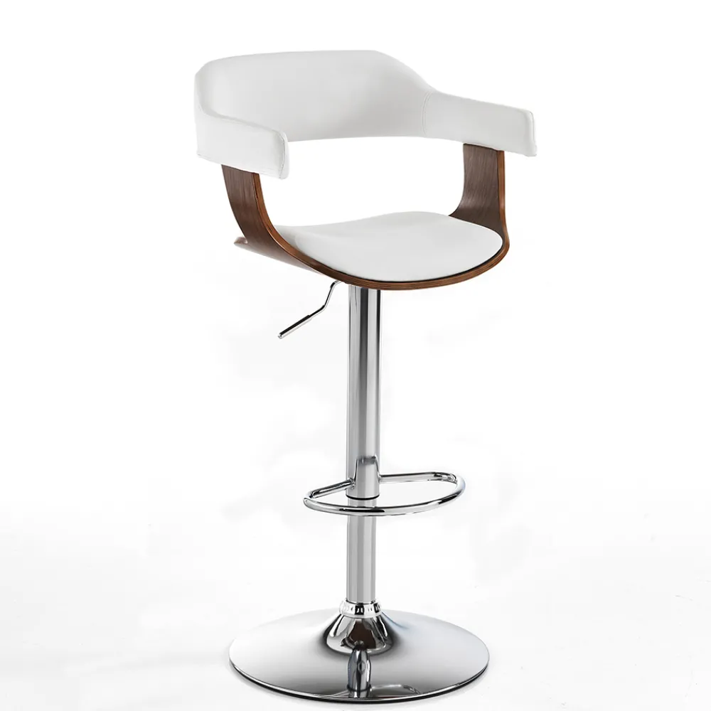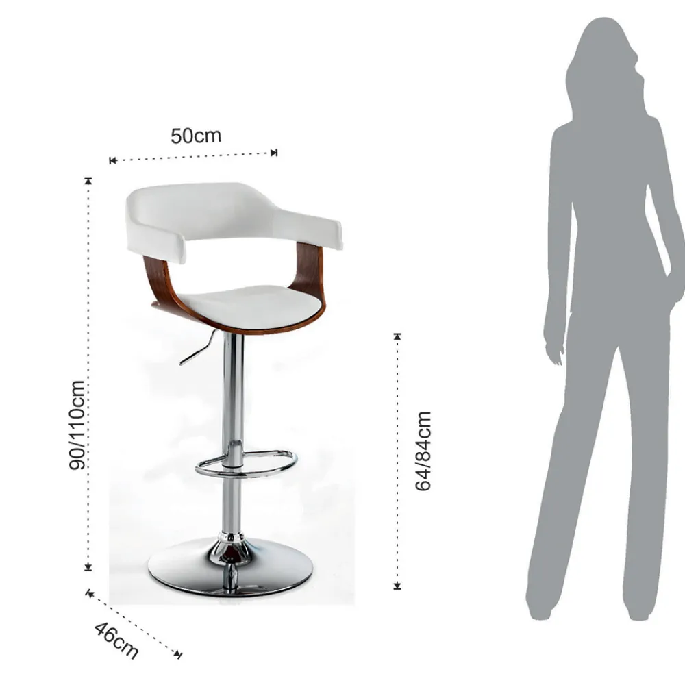 Küchenhocker mit Sitz und Rückenlehne aus nussbaumgebeiztem Sperrholz und weißem Kunstleder und Untergestell aus verchromtem Metall mit praktischer Fußstütze und verstellbarer Gasfeder , mit der Sie die Sitzhöhe bis maximal 84 cm anpassen können. Seine Ästhetik verkörpert Modernität, Vielseitigkeit und Funktionalität ; perfekt für die Dekoration Ihrer Küche oder Eckbar, aber auch in Objektumgebungen wie Restaurants, Hotels und Büros. Die wundervolle Kombination der imposanten Holznote und der zeitlosen Eleganz des Leders lässt einen originellen , avantgardistischen Stuhl mit einer starken zeitgenössischen Persönlichkeit entstehen .