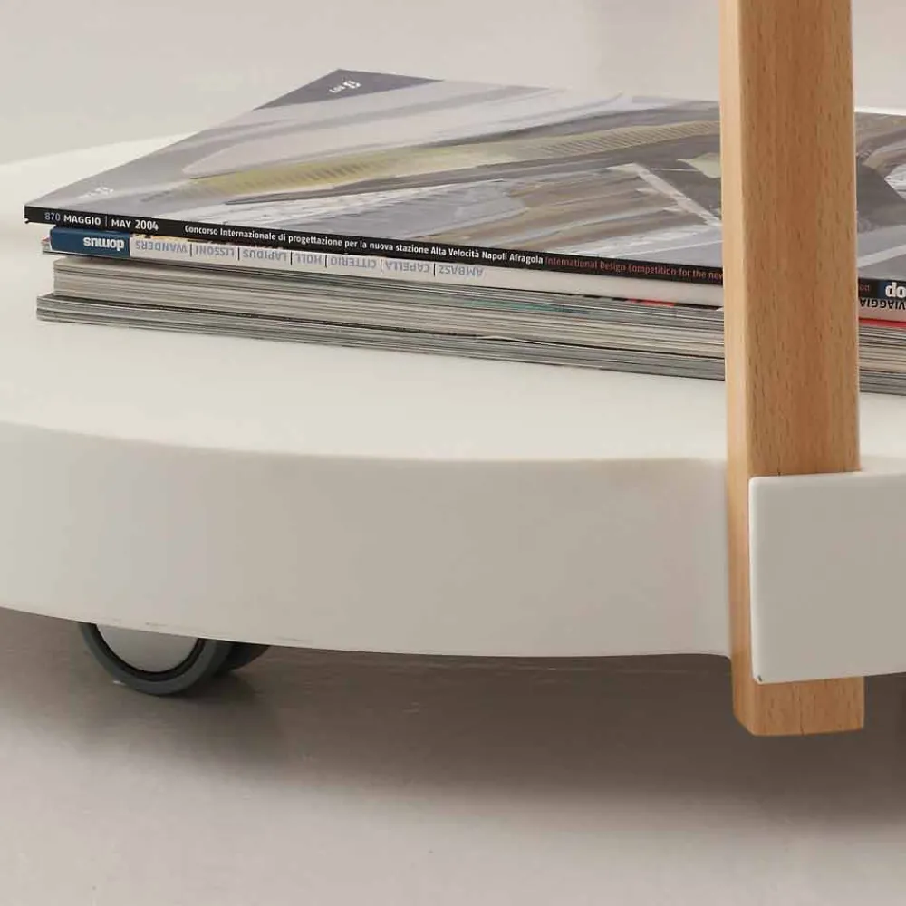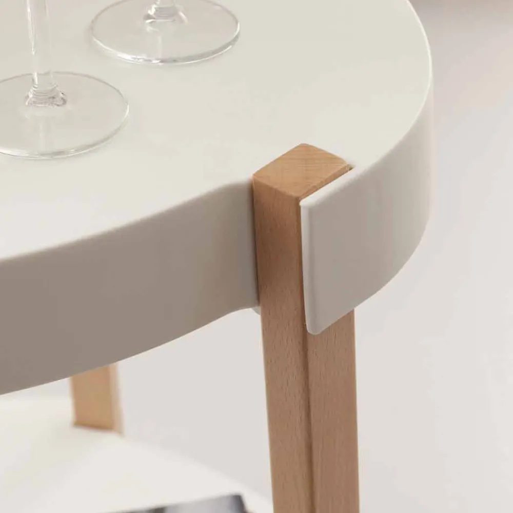 Das Gestell ist aus Buchenholz hergestellt und die Tischplatten aus Polypropylen weiß.