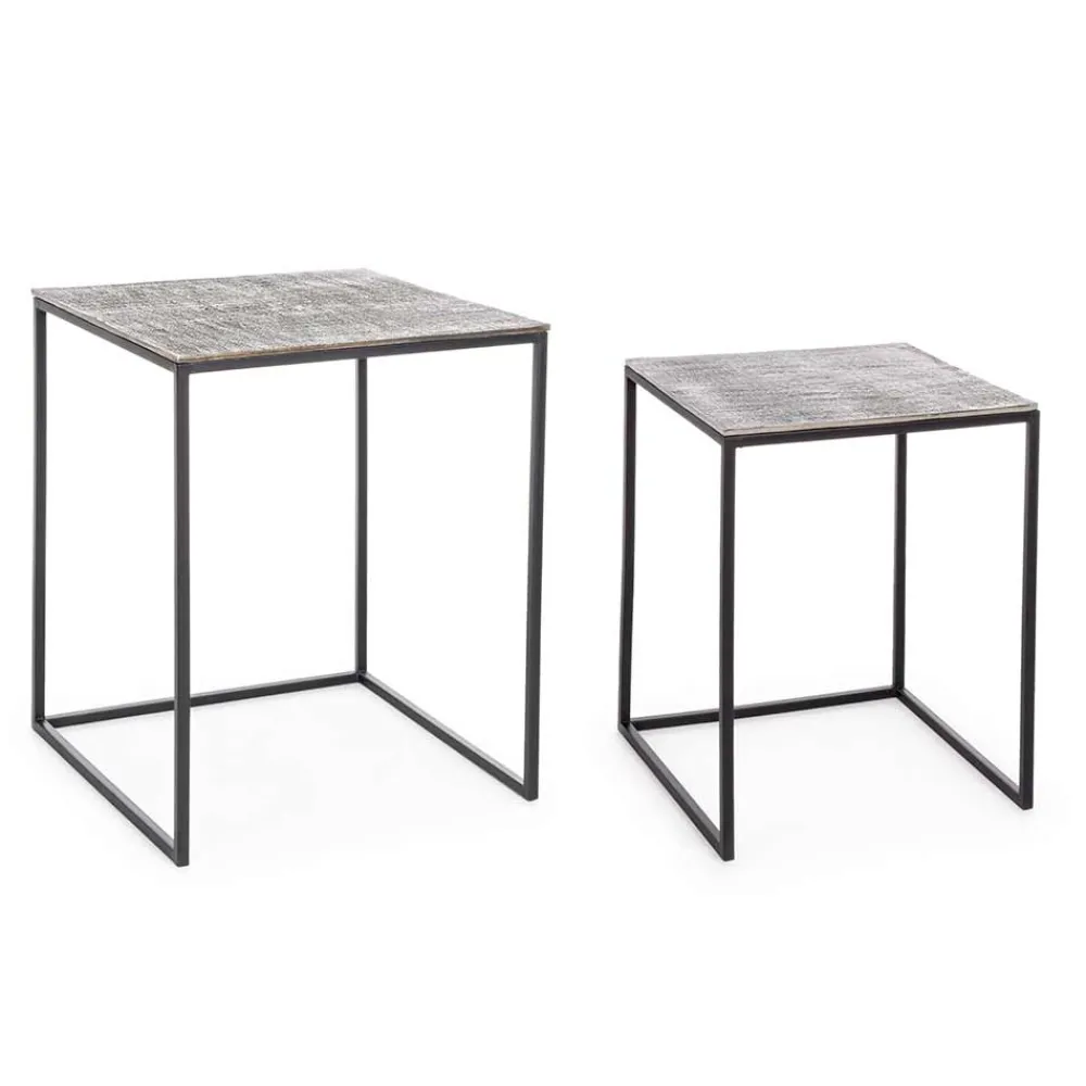 Paar quadratische Couchtische aus Aluminium und Stahl.