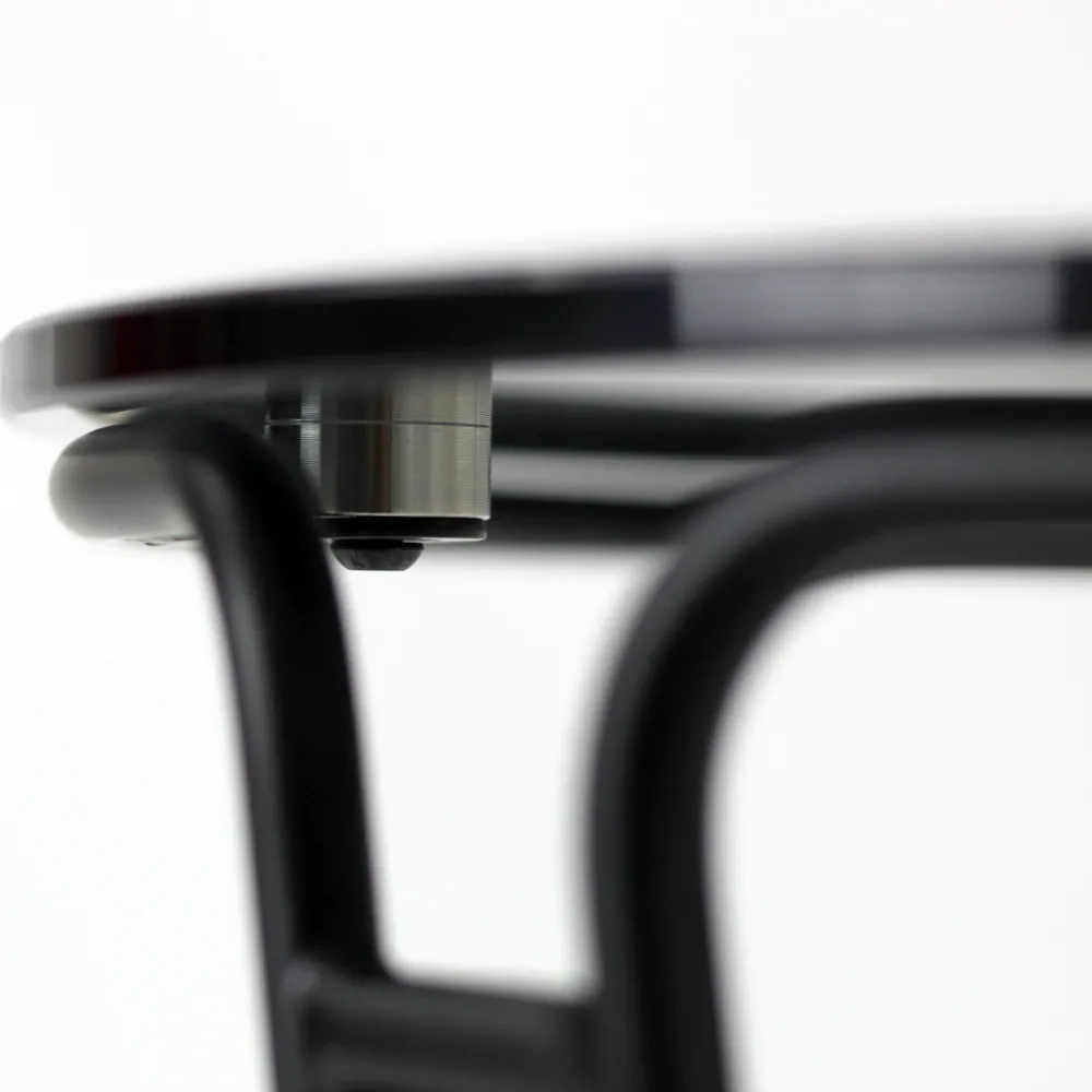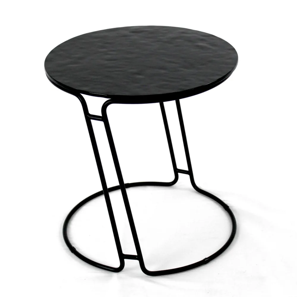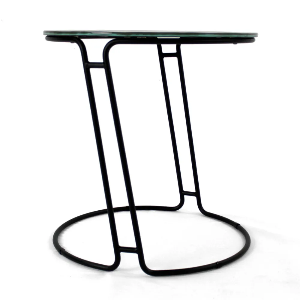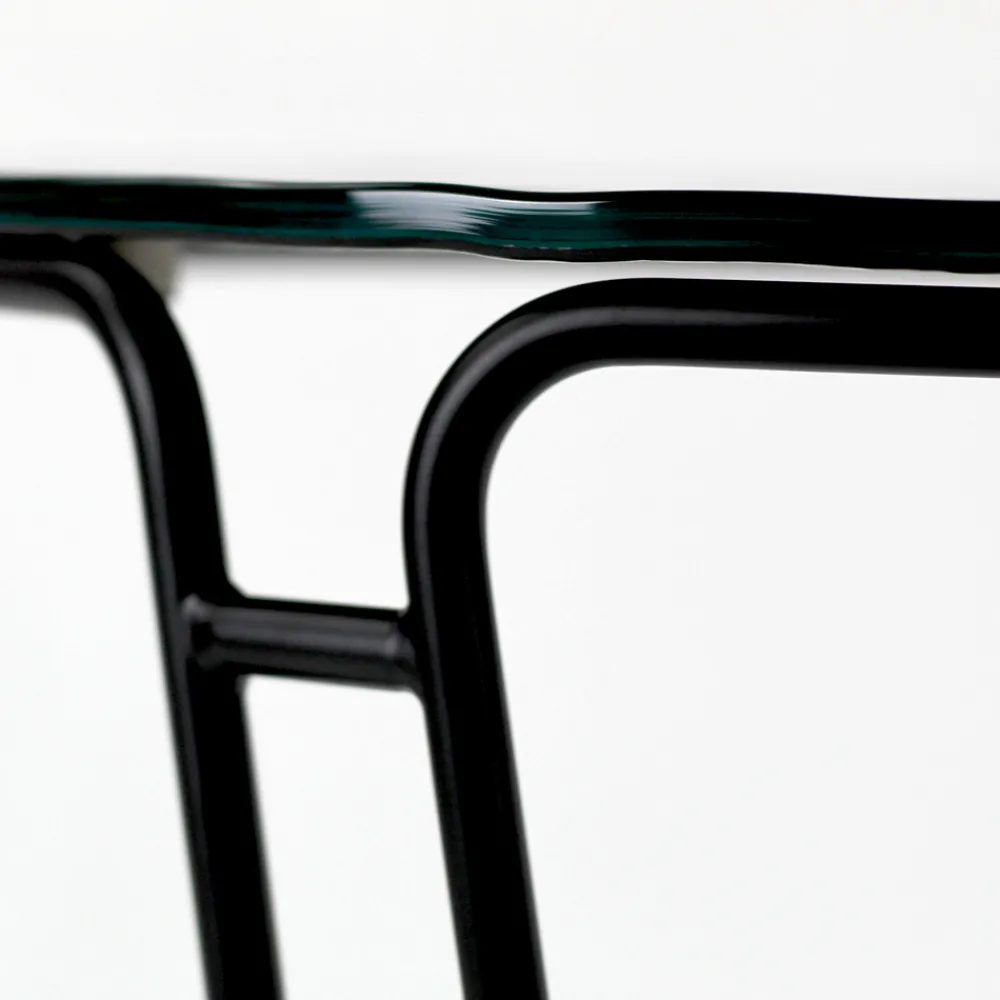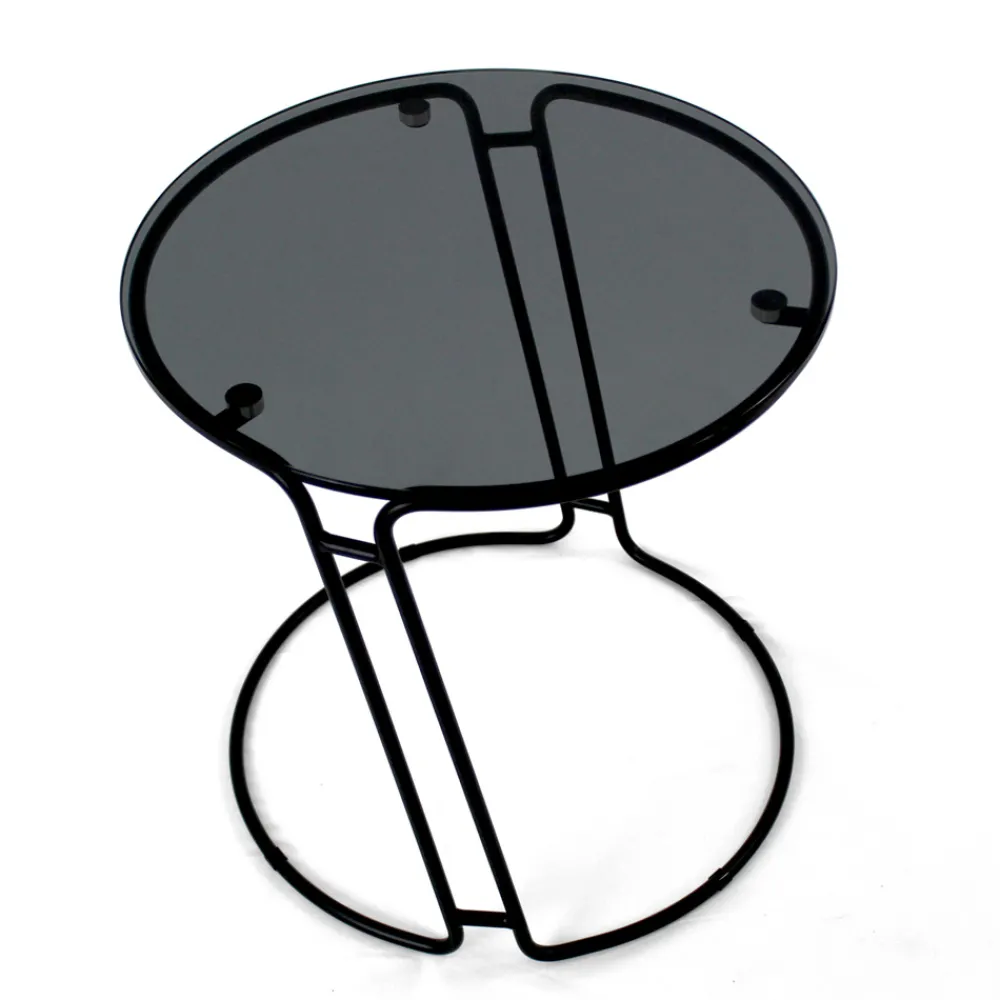 Runder Couchtisch mit lackiertem Stahlsockel und Glasplatte.