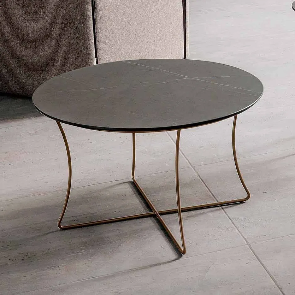 Couchtisch mit runder Platte aus geschichtetem HPL (Stärke 10 mm) und Sockel aus mit Epoxidpulvern in Bronze lackiertem Metall . Dieses in Italien aus wertvollen Rohstoffen hergestellte Möbelstück stellt eine innovative Idee dar, die die Eleganz der wunderbaren Oberflächen verkörpert, die mit der Modernität des Sockels vorgeschlagen werden, um einem Tisch mit ebenso einfachen wie wirkungsvollen Linien Leben einzuhauchen. Ideal, um Ihr Wohnzimmer mit Stil und Persönlichkeit zu bereichern und zu vervollständigen, ist es in der Lage, jede Umgebung zu charakterisieren, die ihm eine exklusive und revolutionäre Note verleiht . Die zwei verfügbaren Größen ermöglichen es außerdem, wunderbare Kompositionen für ein noch überraschenderes und fesselnderes Ergebnis zu schaffen, dank eines ungewöhnlichen Spiels unterschiedlicher Höhen und Ausführungen. Neben der ästhetischen Seite widmet dieser Tisch der funktionalen Seite besondere Aufmerksamkeit, indem er dank der Verwendung von HPL eine gegen chemische Mittel, Abrieb und Kratzer beständige Auflagefläche bietet, ein Material, das auch eine solide und robuste Oberfläche gewährleistet, die unverändert bleiben kann über Zeit seine ästhetischen Eigenschaften.