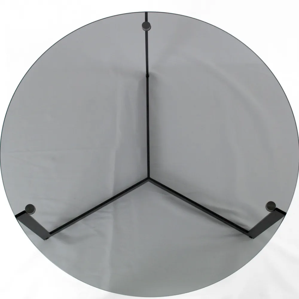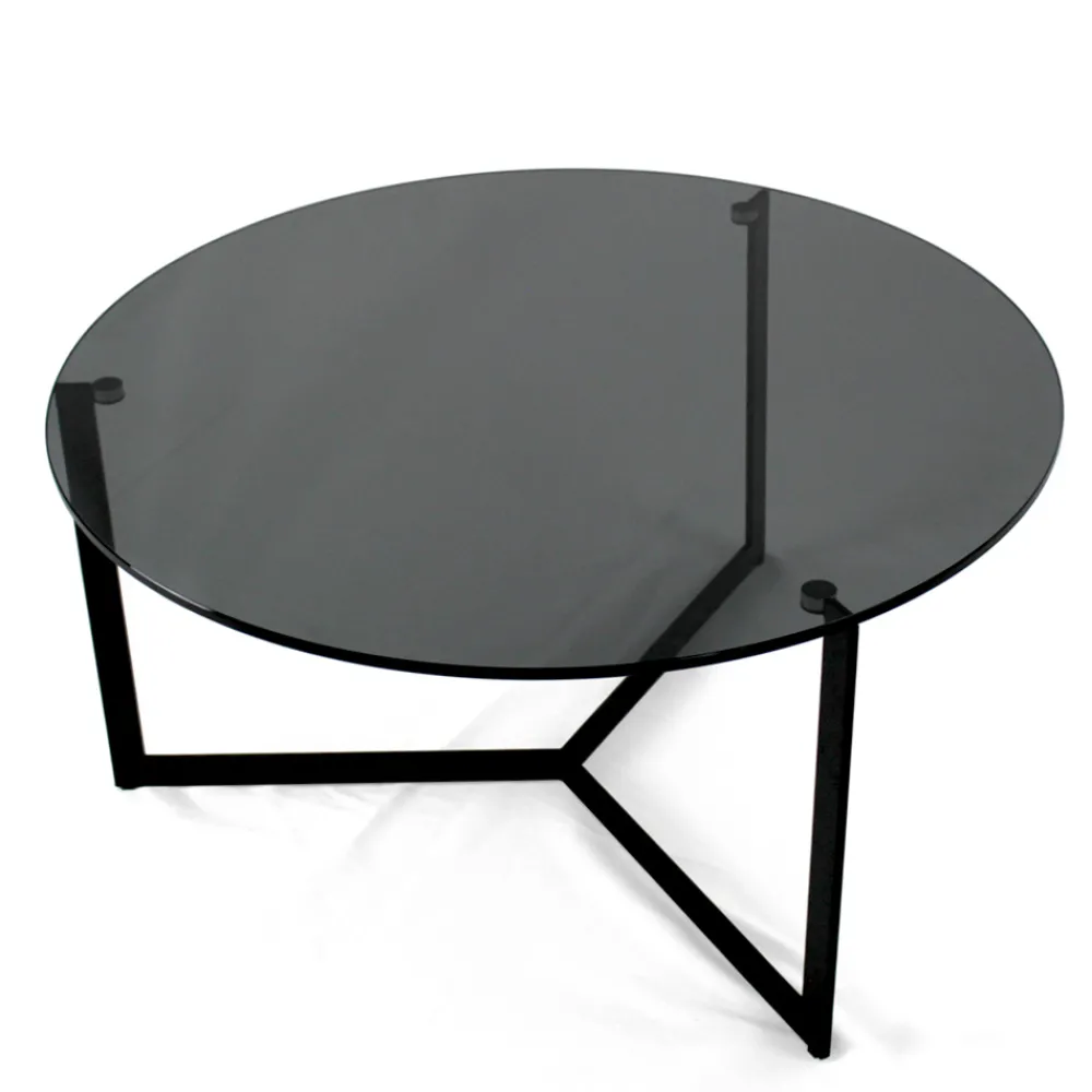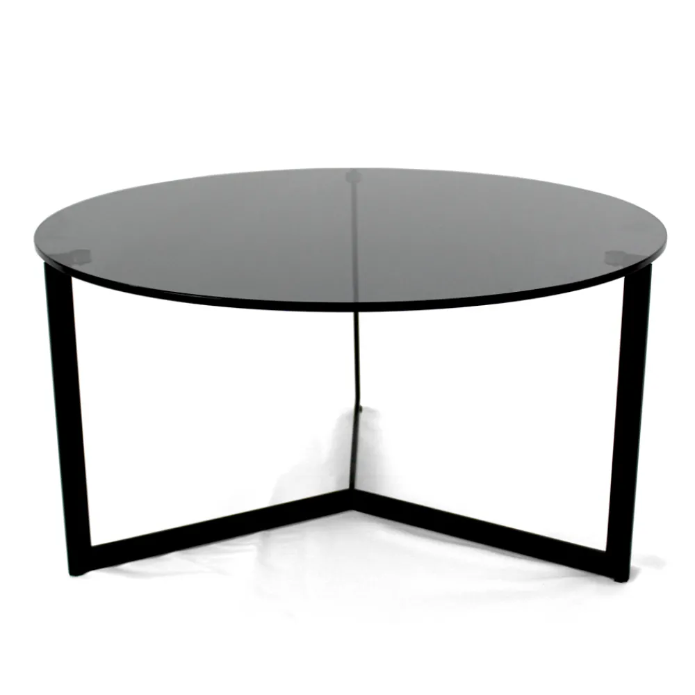 Runder Couchtisch mit Untergestell aus lackiertem Stahl und Glasplatte.