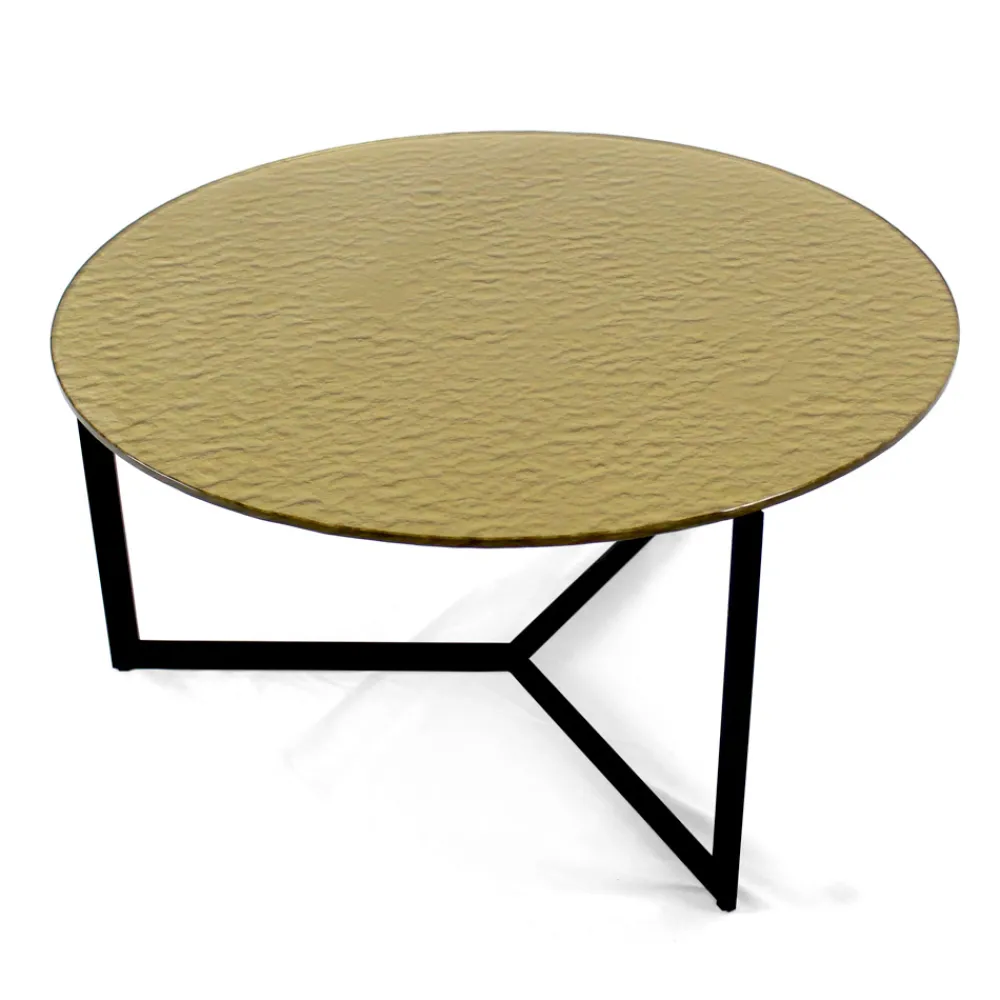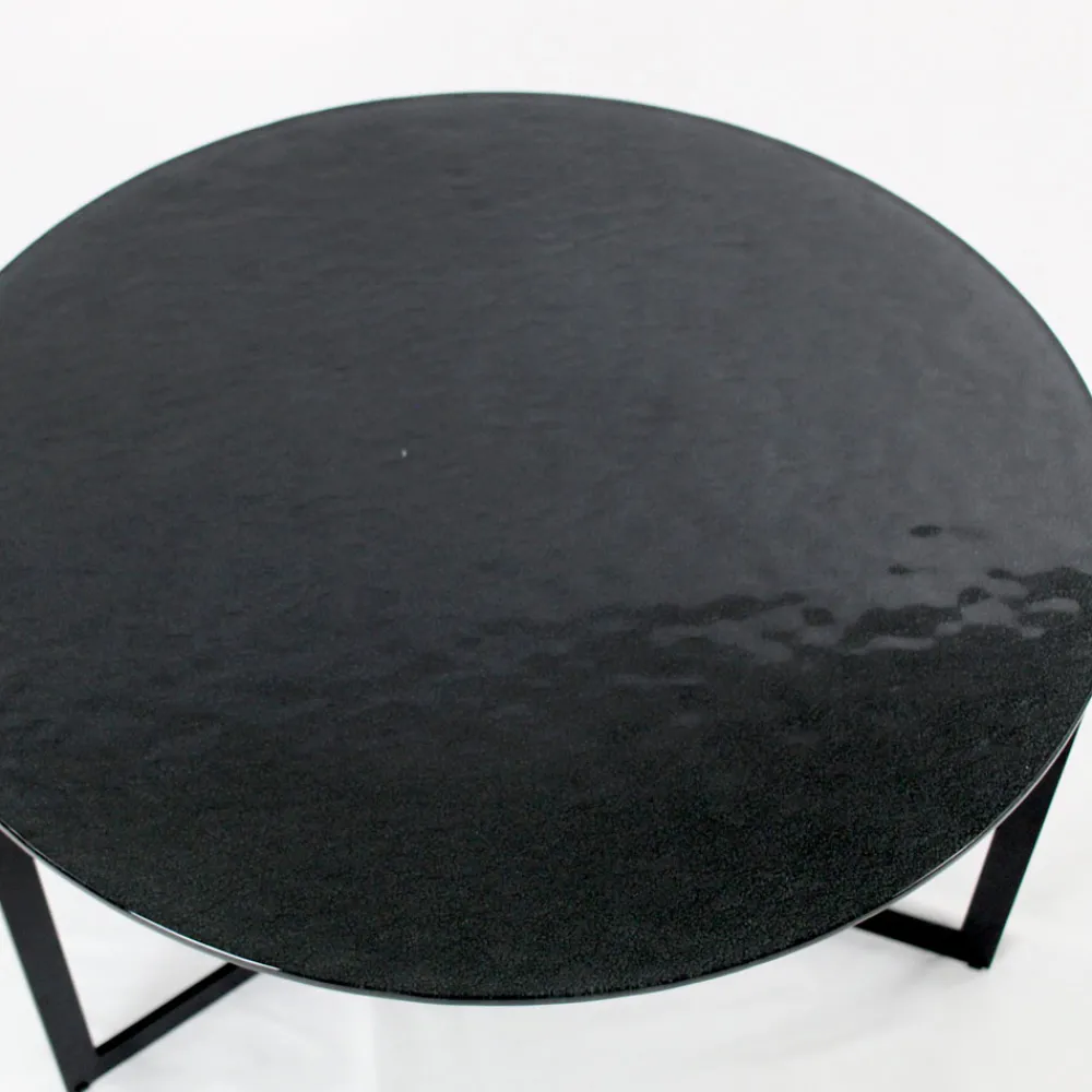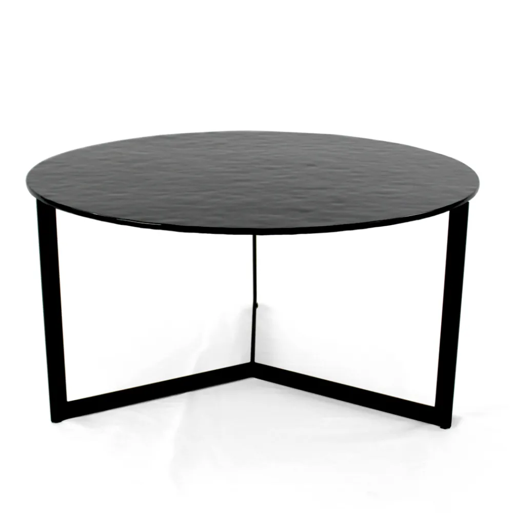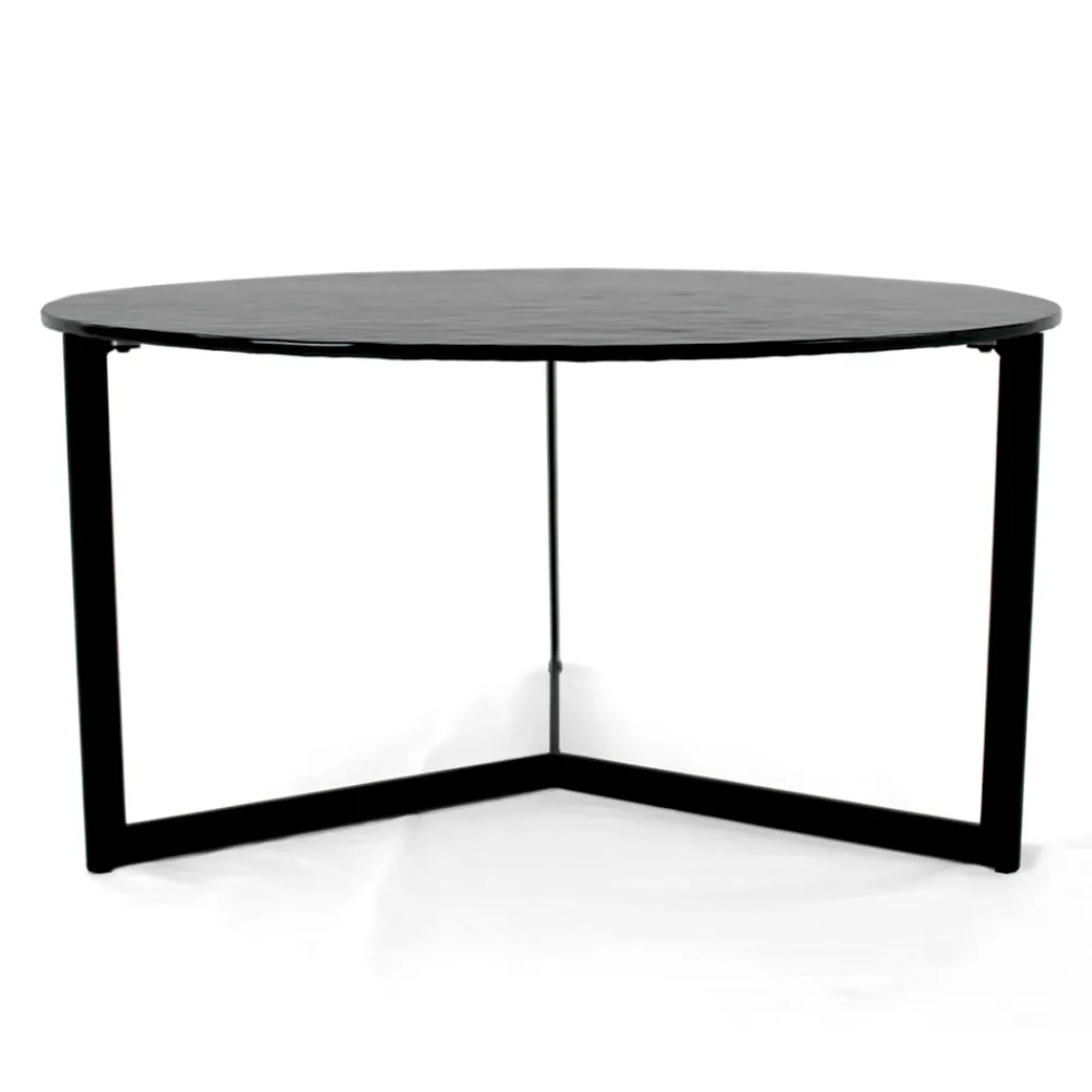Runder Couchtisch mit Untergestell aus lackiertem Stahl und Glasplatte.