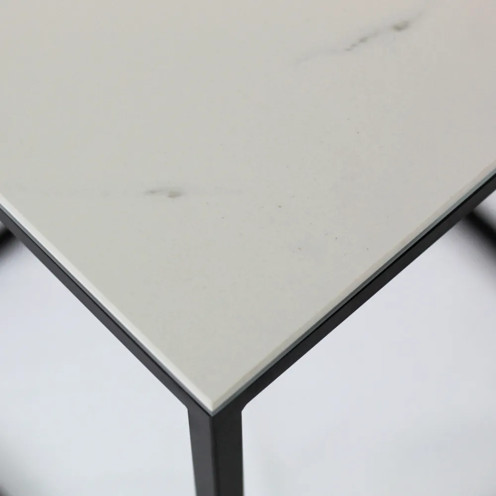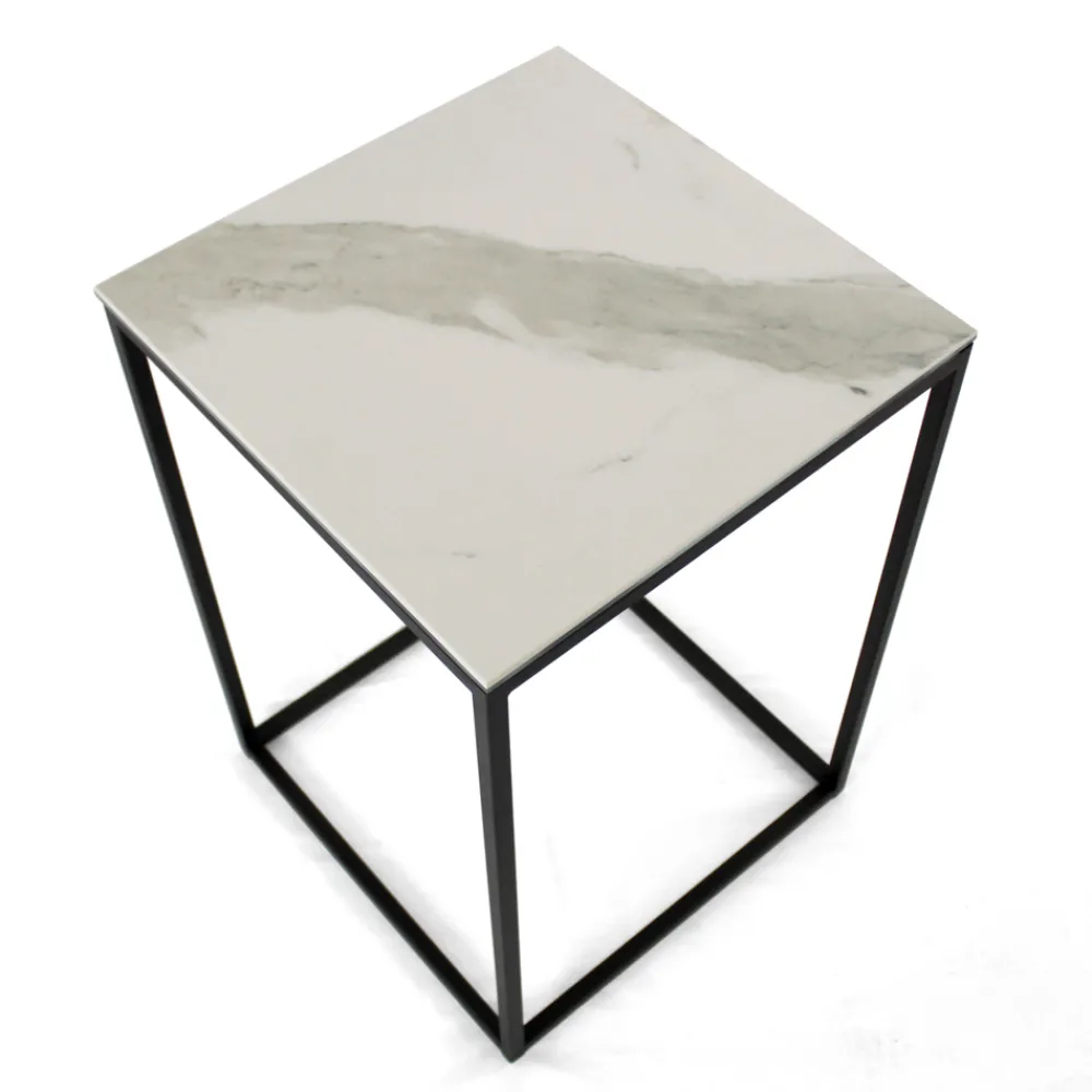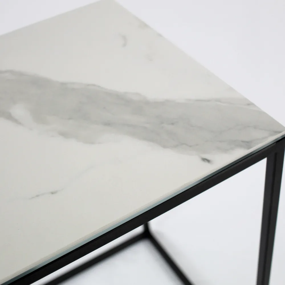 Quadratischer Couchtisch mit lackiertem Stahlsockel und Tischplatte aus 3 mm dickem, matt geädertem Steinzeug in Statuenweiß, laminiert mit 6 mm dickem Floatglas. Die Couchtische im modernen Stil stellen das perfekte Möbelstück dar, um die Dekoration jedes Wohn- und Wohnzimmers zu vervollständigen. Diese Produkte sind einzigartig, elegant und funktional zugleich, dank ihrer einfachen und harmonischen Verarbeitung, die sie für jeden Bedarf und Anlass geeignet macht. Die für die Konstruktion verwendeten Materialien garantieren auch im Laufe der Zeit eine hohe Qualität und Widerstandsfähigkeit.