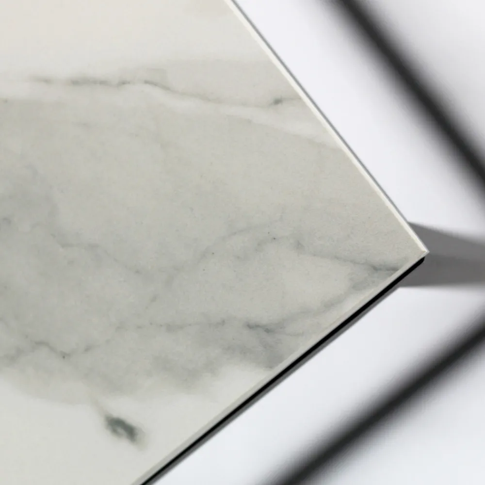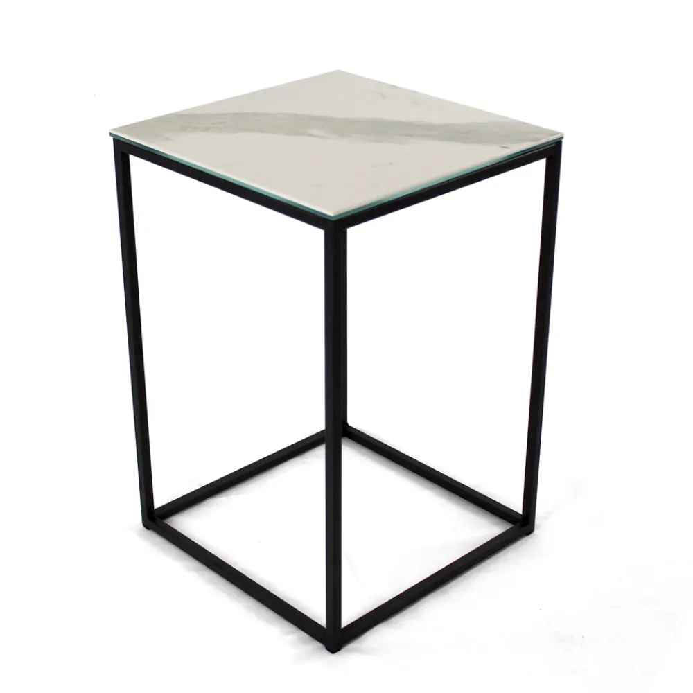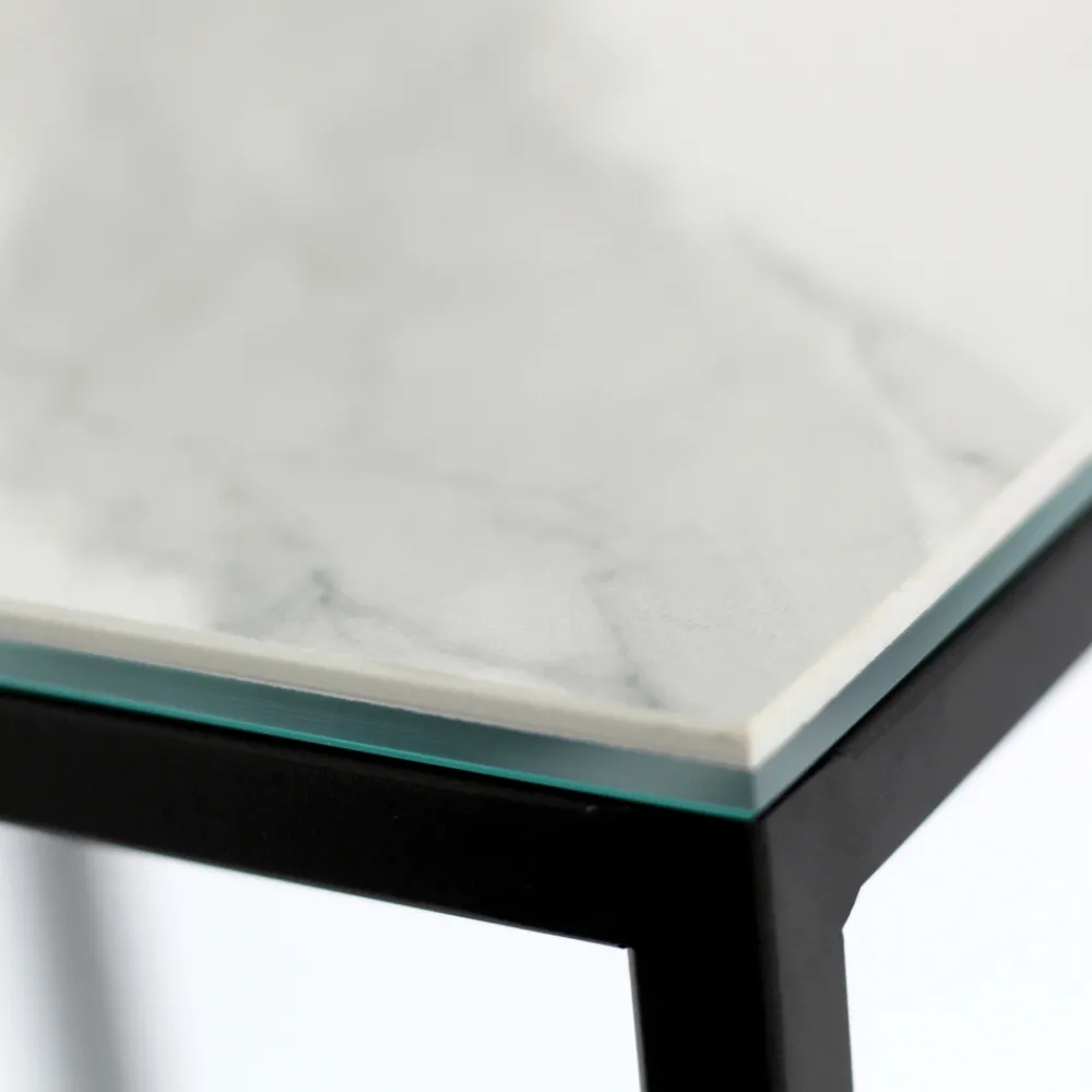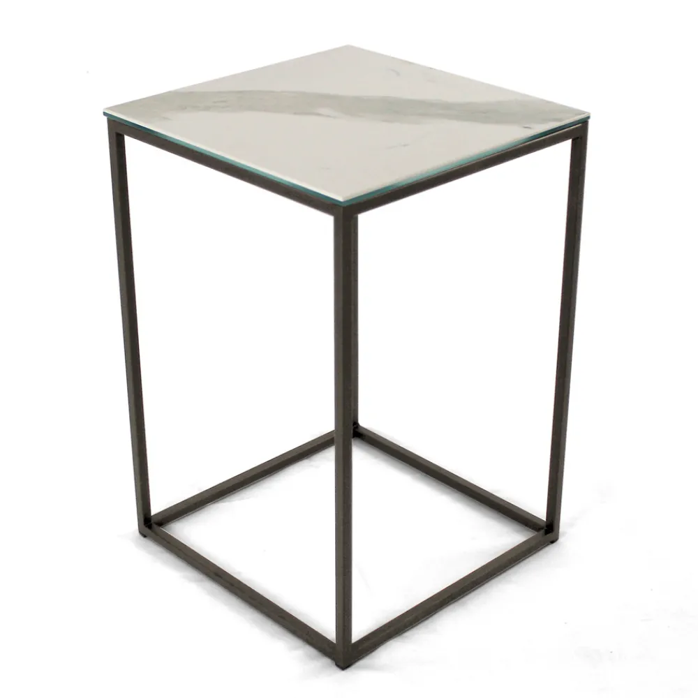 Quadratischer Couchtisch mit lackiertem Stahlsockel und Tischplatte aus 3 mm dickem, matt geädertem Steinzeug in Statuenweiß, laminiert mit 6 mm dickem Floatglas. Die Couchtische im modernen Stil stellen das perfekte Möbelstück dar, um die Dekoration jedes Wohn- und Wohnzimmers zu vervollständigen. Diese Produkte sind einzigartig, elegant und funktional zugleich, dank ihrer einfachen und harmonischen Verarbeitung, die sie für jeden Bedarf und Anlass geeignet macht. Die für die Konstruktion verwendeten Materialien garantieren auch im Laufe der Zeit eine hohe Qualität und Widerstandsfähigkeit.